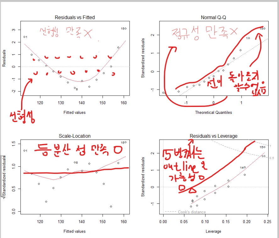 3) 선형성 : 독립변수의 변화에 따라 종속변수도 변화하나 일정한 패턴을 가지면 좋지 않다.