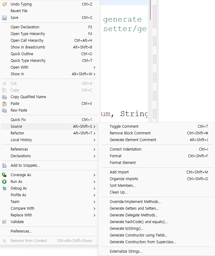 Source에서 Fields 와 getter, setter를 자동으로 생성해준다.