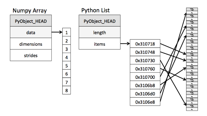 반면에 numpy의 Array는 배열의 맨 앞의 주소 하나만 기억하고 있으면 나머지 값들은 알어서 참조되서 같이 들어오기 때문에 모든 아이템의 주소는 같다. 물론 인덱싱을 사용하여 2번째, 3번째만을 불러올 수있다.