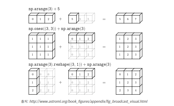 브로드캐스팅(Broadcasting)은 모양이 다른 배열들 간의 연산이 어떤 조건을 만족했을 때 가능해지도록 배열을 자동적으로 변환하는 것이라고 정의할 수 있다. 그리고 누락되었거나 길이가 1인 차원에 대해 브로드캐스팅이 수행된다.위의 세 그림은 배열 연산에서 항상 1차원 배열이 포함되어 있다. 그리고 행/열의 어떤 축이든(;0번/1번 어떤 축이든) 차원의 길이가 같은 것을 알 수 있다. 3x3 + 1x3, 3x1 + 1x3브로드캐스팅이 일어날 수 있는 조건은 다음과 같다.- 차원의 크기가 1일때 가능하다