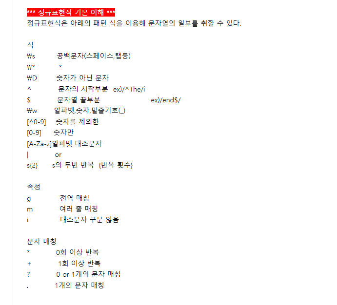 정규표현식 기본 이해 # 정규 표현식 : 다량의 데이터에서 원하는 데이터만 선택해서 처리할 때 효과적 import re // 정규식 표현 함수 import ss = "1234 abc가나다abc_mbcABC_123555_6한국'Python is fun.'" print(ss) print(re.findall(r'123', ss)) # 123 나오게 하기 print(re.findall(r'가나다', ss)) # 가나다 나오게 하기 print(re.findall(r'1', ss)) # 숫자 나오게 하기(낱개) print(re.findall(r'[1-2]', ss)) # 숫자 나오게 하기(낱개) print(re.findall(r'[0-9]', ss)) # 숫자 나오게 하기(낱개) print(re.findall(r'[0-9]+', ss)) # 뒤에 +를 붙이면 띄어쓰기 기준으로 한번에 반환해준다. print(re.findall(r'[0-9]{2}', ss)) # 반복 횟수를 말한다. 2개씩 자르기 print(re.findall(r'[0-9]{2,3}', ss)) # 반복 횟수를 말한다. 3개씩 자르기 print(re.findall(r'[a-z]+', ss)) # a부터 z 까지 소문자 나오게 하기 print(re.findall(r'[A-Za-z]+', ss)) print(re.findall(r'[가-힣]+', ss)) # 한글 나오게 하기 print(re.findall(r'[^가-힣]+', ss)) # ^를 사용하면 부정의 의미 print(re.findall(r'12|34', ss)) print(re.findall(r'.bc', ss)) # 앞에는 아무거나 + bc 인 문자 나오게 하기 print(re.findall(r'...', ss)) # 3글자인 문자 나오게 하기 print(re.findall(r'[^1]+', ss)) print(re.findall(r'^1+', ss)) print(re.findall(r'fun.$', ss)) print(re.findall(r'\d', ss)) print(re.findall(r'\d+', ss)) print(re.findall(r'\s+', ss)) print(re.findall(r'\S', ss)) print(re.findall(r'\d{1,3}', ss)) # 숫자 1~3까지 <console> 1234 abc가나다abc_mbcABC_123555_6한국'Python is fun.' ['123', '123'] ['가나다'] ['1', '1'] ['1', '2', '1', '2'] ['1', '2', '3', '4', '1', '2', '3', '5', '5', '5', '6'] ['1234', '123555', '6'] ['12', '34', '12', '35', '55'] ['123', '123', '555'] ['abc', 'abc', 'mbc', 'ython', 'is', 'fun'] ['abc', 'abc', 'mbcABC', 'Python', 'is', 'fun'] ['가나다', '한국'] ['1234 abc', 'abc_mbcABC_123555_6', "'Python is fun.'"] ['12', '34', '12'] ['abc', 'abc', 'mbc'] ['123', '4 a', 'bc가', '나다a', 'bc_', 'mbc', 'ABC', '_12', '355', '5_6', "한국'", 'Pyt', 'hon', ' is', ' fu', "n.'"] ['234 abc가나다abc_mbcABC_', "23555_6한국'Python is fun.'"] ['1'] [] ['1', '2', '3', '4', '1', '2', '3', '5', '5', '5', '6'] ['1234', '123555', '6'] [' ', ' ', ' '] ['1', '2', '3', '4', 'a', 'b', 'c', '가', '나', '다', 'a', 'b', 'c', '_', 'm', 'b', 'c', 'A', 'B', 'C', '_', '1', '2', '3', '5', '5', '5', '_', '6', '한', '국', "'", 'P', 'y', 't', 'h', 'o', 'n', 'i', 's', 'f', 'u', 'n', '.', "'"] ['123', '4', '123', '555', '6']정규식 표현은 먼저 re를 import 해서 사용한다. findall 로 호출하게 되면 list 타입으로 반환해준다. 앞에 r 을 적어줌으로서 ‘’ 안의 모든 것을 읽어준다.