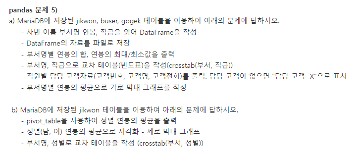 # MariaDB에 저장된 jikwon 테이블을 이용하여 아래의 문제에 답하시오. # - pivot_table을 사용하여 성별 연봉의 평균을 출력 # - 성별(남, 여) 연봉의 평균으로 시각화 - 세로 막대 그래프 # - 부서명, 성별로 교차 테이블을 작성 (crosstab(부서, 성별)) import MySQLdb import pickle import numpy as np import pandas as pd import matplotlib.pyplot as plt plt.rc('font', family='malgun gothic') plt.rcParams['axes.unicode_minus'] = False import sys try : with open('mydb.dat', mode='rb') as obj: config = pickle.load(obj) except Exception as e: print('connect err : ', e) sys.exit() try: conn = MySQLdb.connect(**config) cursor = conn.cursor() sql = """ select buser_name,jikwon_gen,jikwon_pay from jikwon inner join buser on buser_num=buser_no """ print('pandas의 sql 처리 기능 사용해서 읽기') df = pd.read_sql(sql, conn) df.columns = ['부서','성별','연봉'] print(df.head(3)) print() print(df.pivot_table(values=['연봉'], index=['성별'], aggfunc=np.mean)) # 시각화 : 성별 연봉 평균 m = df[df['성별'] == '남'] m_pay_mean = m.loc[:,'연봉'].mean() f = df[df['성별'] == '여'] f_pay_mean = f.loc[:,'연봉'].mean() mean_pay = [m_pay_mean, f_pay_mean] plt.bar(range(len(mean_pay)), mean_pay, color=['black','yellow']) plt.xlabel('성별') plt.ylabel('연봉') plt.xticks(range(len(mean_pay)), labels=['남성','여성']) for i, v in enumerate(range(len(mean_pay))): plt.text(v, mean_pay[i], mean_pay[i], fontsize=12, color='blue', horizontalalignment='center', verticalalignment='bottom') plt.show() ctab = pd.crosstab(df['부서'], df['성별']) print(ctab) except Exception as e: print('처리 오류 : ', e) <console> pandas의 sql 처리 기능 사용해서 읽기 부서 성별 연봉 0 총무부 남 9900 1 영업부 여 8800 2 영업부 남 7900 연봉 성별 남 5980 여 4630 성별 남 여 부서 관리부 2 2 영업부 4 8 전산부 3 4 총무부 6 1