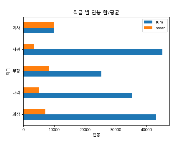 <!DOCTYPE html> <html> <head> <meta charset="UTF-8"> <title>Insert title here</title> </head> <body> <h2>직원 자료</h2> {% if datas %} {{datas|safe}} {% endif %} <hr> 직급별 연봉 합:<br /> 과장 : {{jik_group.sum.과장}} <br /> 대리 : {{jik_group.sum.대리}} <br /> 사원 : {{jik_group.sum.사원}} <br /> <hr> {{jik_group_detail | safe}} <!-- |safe를 넣지 않으면 태그까지 나온다. --> <hr> 직급별 성별 인원수 : <br /> {{ctab|safe}} <br /> <img src="/static/images/jik.png"/> </body> </html>pandas의 DataFrame(to_html())을 사용하면 table을 만들지 않아도 알아서 만들어진다. |safe는 꼭 사용!