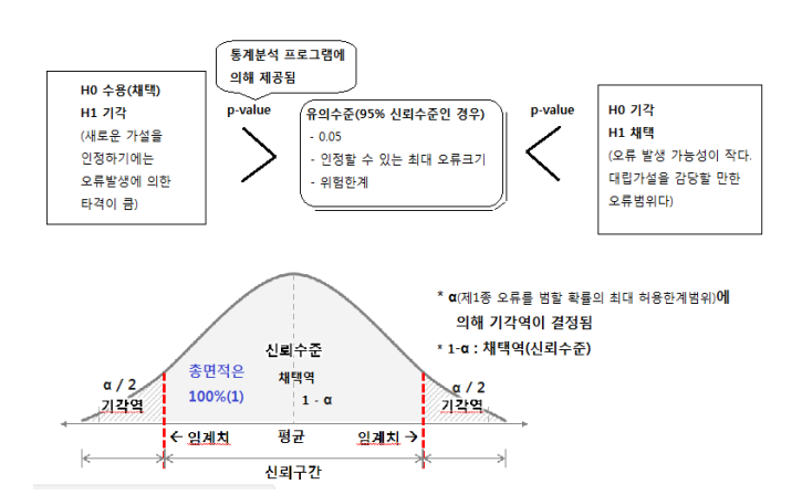 데이터의 신뢰성을 판단할 때도 p-value를 사용하지만 귀무가설 채택, 기각 할때도 p-value를 사용한다.(0.05(5%) 기준)