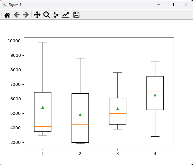 # [ANOVA 예제 2] # DB에 저장된 buser와 jikwon 테이블을 이용하여 총무부, 영업부, 전산부, 관리부 직원의 연봉의 평균에 차이가 있는지 검정하시오. # 만약에 연봉이 없는 직원이 있다면 작업에서 제외한다. import MySQLdb import pickle # 귀무 : 총무부, 영업부, 전산부, 관리부 직원의 연봉의 평균에 차이는 없다. # 대립 : 총무부, 영업부, 전산부, 관리부 직원의 연봉의 평균에 차이는 있다. with open('mydb.dat', mode='rb') as obj: config = pickle.load(obj) try: conn = MySQLdb.connect(**config) cursor = conn.cursor() sql = """ select buser_name, jikwon_pay from jikwon JOIN buser ON buser_num = buser_no """ cursor.execute(sql) # datas = cursor.fetchall() # 이 방법도 있다. datas = pd.read_sql(sql, conn) df = pd.DataFrame(datas) df.columns = '부서명', '연봉' print(df.head(4)) # print("부서멸 연봉의 합 : ", df.groupby(['부서명'])['연봉'].sum()) print("부서별 연봉의 합 : ", df.groupby(['부서명'])['연봉'].mean()) # 6262 vs 4908 vs 5328 vs 5414 평균 차이? a = df[df['부서명'] == '총무부'] a_pay_mean = a.loc[:,'연봉'] print(a_pay_mean) b = df[df['부서명'] == '영업부'] b_pay_mean = b.loc[:,'연봉'] print(b_pay_mean) c = df[df['부서명'] == '전산부'] c_pay_mean = c.loc[:,'연봉'] print(c_pay_mean) d = df[df['부서명'] == '관리부'] d_pay_mean = d.loc[:,'연봉'] print(d_pay_mean) # 한 개의 표본이 같은 분포를 따르는지 정규성 확인 print(stats.shapiro(a_pay_mean)) # pvalue=0.02604 < 0.05 이므로 정규성 불만족 print(stats.shapiro(b_pay_mean)) # pvalue=0.02560 < 0.05 이므로 정규성 불만족 print(stats.shapiro(c_pay_mean)) # pvalue=0.41940 < 0.05 이므로 정규성 만족 print(stats.shapiro(d_pay_mean)) # pvalue=0.90780 < 0.05 이므로 정규성 만족 print() # 두 개의 표본이 같은 분포를 따르는지 정규성 확인 print(stats.ks_2samp(a_pay_mean, b_pay_mean).pvalue) # 0.33577 > 0.05 이므로 정규성 만족 print(stats.ks_2samp(a_pay_mean, c_pay_mean).pvalue) # 0.57517 > 0.05 이므로 정규성 만족 print(stats.ks_2samp(a_pay_mean, d_pay_mean).pvalue) # 0.53636 > 0.05 이므로 정규성 만족 print(stats.ks_2samp(b_pay_mean, c_pay_mean).pvalue) # 0.33577 > 0.05 이므로 정규성 만족 print(stats.ks_2samp(b_pay_mean, d_pay_mean).pvalue) # 0.64065 > 0.05 이므로 정규성 만족 print(stats.ks_2samp(c_pay_mean, d_pay_mean).pvalue) # 0.53636 > 0.05 이므로 정규성 만족 print() # 등분산성 : 만족하지 않으면 welchi_anova test 사용 print(stats.bartlett(a_pay_mean, b_pay_mean, c_pay_mean, d_pay_mean).pvalue) # 0.62909 > 0.05 이므로 등분산성 만족 # 데이터의 퍼짐 정도 시각화 plt.boxplot([a_pay_mean, b_pay_mean, c_pay_mean, d_pay_mean], showmeans = True) plt.show() print() # 일원분산분석 방법 : f_oneway() f_sta, pvalue = stats.f_oneway(a_pay_mean, b_pay_mean, c_pay_mean, d_pay_mean) print('f통계량 : ', f_sta) # 0.41244 print('유의확률 : ', pvalue) # 0.74544 > 0.05 이므로 귀무 채택. # 귀무 : 총무부, 영업부, 전산부, 관리부 직원의 연봉의 평균에 차이는 없다. # 사후검정 from statsmodels.stats.multicomp import pairwise_tukeyhsd turkeyResult = pairwise_tukeyhsd(endog = df.연봉, groups = df.부서명) print(turkeyResult) # 차이가 없으면 reject가 False가 나오고, 차이가 크면 True가 나온다. # 시각화 turkeyResult.plot_simultaneous(xlabel = 'mean', ylabel = 'group') plt.show() except Exception as e: print('err :', e) finally: cursor.close() conn.close() <console> 부서명 연봉 0 총무부 9900 1 영업부 8800 2 영업부 7900 3 전산부 4500 부서별 연봉의 합 : 부서명 관리부 6262.500000 영업부 4908.333333 전산부 5328.571429 총무부 5414.285714 Name: 연봉, dtype: float64 0 9900 9 3700 12 4900 16 8000 24 3800 25 3500 28 4100 Name: 연봉, dtype: int64 1 8800 2 7900 4 3000 5 2950 7 7800 14 4000 15 3000 19 2900 20 2950 23 4500 26 5900 27 5200 Name: 연봉, dtype: int64 3 4500 8 5000 10 3900 17 7800 18 5500 22 6600 29 4000 Name: 연봉, dtype: int64 6 8600 11 7200 13 3400 21 5850 Name: 연봉, dtype: int64 ShapiroResult(statistic=0.7803537845611572, pvalue=0.02604489028453827) ShapiroResult(statistic=0.8372057676315308, pvalue=0.02560843899846077) ShapiroResult(statistic=0.9133293628692627, pvalue=0.4194071292877197) ShapiroResult(statistic=0.9809899926185608, pvalue=0.9078023433685303) 0.3357743907279511 0.5751748251748252 0.5363636363636364 0.3357743907279511 0.6406593406593406 0.5363636363636364 0.6290955395410989 f통계량 : 0.41244077160708414 유의확률 : 0.7454421884076983 Multiple Comparison of Means - Tukey HSD, FWER=0.05 =========================================================== group1 group2 meandiff p-adj lower upper reject ----------------------------------------------------------- 관리부 영업부 -1354.1667 0.6937 -4736.5568 2028.2234 False 관리부 전산부 -933.9286 0.897 -4605.9199 2738.0628 False 관리부 총무부 -848.2143 0.9202 -4520.2056 2823.7771 False 영업부 전산부 420.2381 0.9756 -2366.0209 3206.4971 False 영업부 총무부 505.9524 0.9588 -2280.3066 3292.2114 False 전산부 총무부 85.7143 0.9998 -3045.7705 3217.199 False -----------------------------------------------------------
