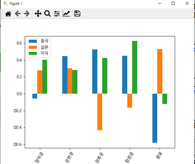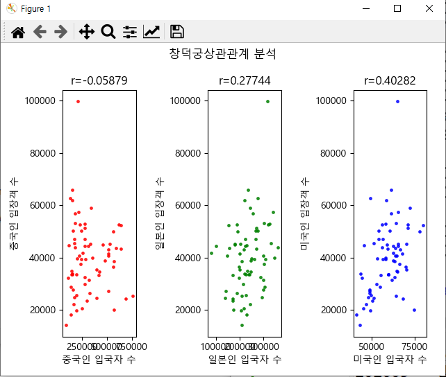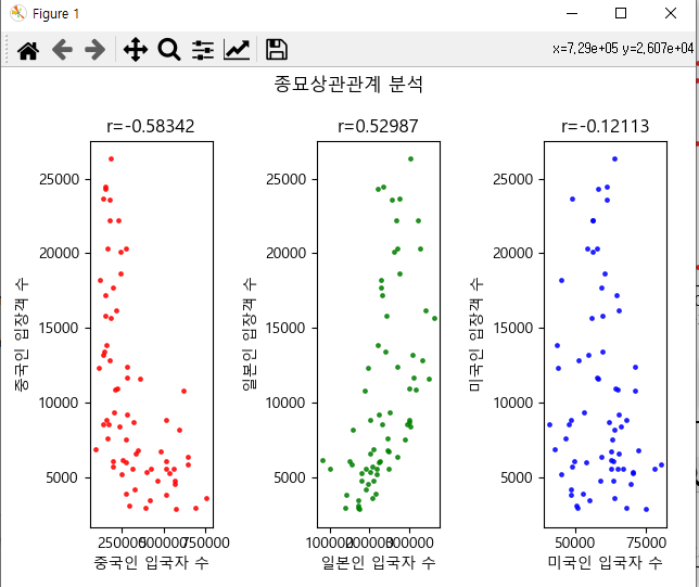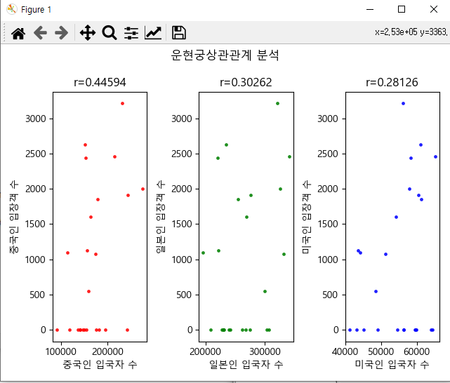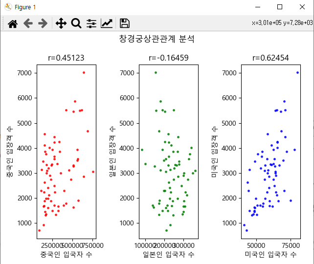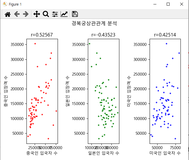 # data.go.kr 제공 관광정보 자료로 상관관계 분석 # 미국, 중국, 일본 관광객이 국내 유료관광지(5대 궁) 방문관련 import json import pandas as pd import numpy as np import matplotlib.pyplot as plt plt.rc('font', family = 'malgun gothic') # 그래프 작성용 함수 def makeGraph(tour_table, all_table, tourPoint): # 계산할 관광지명에 해당하는 자료만 뽑아 외국인 관광객 자료와 합치기 tour = tour_table[tour_table['resNm'] == tourPoint] # print(tour) # resNm ForNum # yyyymm # 201101 창덕궁 14137 # 201102 창덕궁 18114 merge_table = pd.merge(tour, all_table, left_index = True, right_index = True) print(merge_table) # resNm ForNum china japan usa # yyyymm # 201101 창덕궁 14137 91252 209184 43065 # 201102 창덕궁 18114 140571 230362 41077 # 상관계수를 구하고 3개국 선포도 시각화 fig = plt.figure() fig.suptitle(tourPoint + '상관관계 분석') plt.subplot(1,3,1) plt.xlabel('중국인 입국자 수') plt.ylabel('중국인 입장객 수') lamb1 = lambda p:merge_table['china'].corr(merge_table['ForNum']) r1 = lamb1(merge_table) # print('r1 : ', r1) plt.title('r={:.5f}'.format(r1)) plt.scatter(merge_table['china'], merge_table['ForNum'], alpha=0.8, s=6, c='red') # 여기서 alpha는 투명도이다. plt.subplot(1,3,2) plt.xlabel('일본인 입국자 수') plt.ylabel('일본인 입장객 수') lamb2 = lambda p:merge_table['japan'].corr(merge_table['ForNum']) r2 = lamb2(merge_table) # print('r2 : ', r2) plt.title('r={:.5f}'.format(r2)) plt.scatter(merge_table['japan'], merge_table['ForNum'], alpha=0.8, s=6, c='green') # 여기서 alpha는 투명도이다. plt.subplot(1,3,3) plt.xlabel('미국인 입국자 수') plt.ylabel('미국인 입장객 수') lamb3 = lambda p:merge_table['usa'].corr(merge_table['ForNum']) r3 = lamb3(merge_table) # print('r3 : ', r3) plt.title('r={:.5f}'.format(r3)) plt.scatter(merge_table['usa'], merge_table['ForNum'], alpha=0.8, s=6, c='blue') # 여기서 alpha는 투명도이다. plt.tight_layout() # plot 사이의 공간을 자동 조절 plt.show() return [tourPoint, r1, r2, r3] def goGo(): # json 자료를 읽어 DataFrame에 담기 fname = '서울특별시_관광지입장정보_2011_2016.json' jsonTP = json.loads(open(fname, mode = 'r', encoding = 'utf-8').read()) # json decoding str -> dict # print(jsonTP) tour_table = pd.DataFrame(jsonTP, columns =('yyyymm', 'resNm', 'ForNum')) # 년월, 관광지명, 입장객수 tour_table = tour_table.set_index('yyyymm') print(tour_table) # resNm ForNum # yyyymm # 201101 창덕궁 14137 resNm = tour_table.resNm.unique() # print('resNm(관광지명) :', resNm) print('resNm(관광지명) :', resNm[:5]) # 중국인 관광객 정보를 읽어 DataFrame에 담기 cdf = "중국인방문객.json" jdata = json.loads(open(cdf, mode = 'r', encoding = 'utf-8').read()) # print(jdata) china_table = pd.DataFrame(jdata, columns =('yyyymm', 'visit_cnt')) china_table = china_table.rename(columns = {'visit_cnt' : 'china'}) china_table = china_table.set_index('yyyymm') # print(china_table) # china # yyyymm # 201101 91252 # 201102 140571 # 일본인 관광객 정보를 읽어 DataFrame에 담기 jdf = "일본인방문객.json" jdata = json.loads(open(jdf, mode = 'r', encoding = 'utf-8').read()) # print(jdata) japan_table = pd.DataFrame(jdata, columns =('yyyymm', 'visit_cnt')) japan_table = japan_table.rename(columns = {'visit_cnt' : 'japan'}) japan_table = japan_table.set_index('yyyymm') # 미국인 관광객 정보를 읽어 DataFrame에 담기 udf = "미국인방문객.json" jdata = json.loads(open(udf, mode = 'r', encoding = 'utf-8').read()) # print(jdata) usa_table = pd.DataFrame(jdata, columns =('yyyymm', 'visit_cnt')) usa_table = usa_table.rename(columns = {'visit_cnt' : 'usa'}) usa_table = usa_table.set_index('yyyymm') # 중국, 일본, 미국 DataFrame merge all_table = pd.merge(left = china_table, right = japan_table, left_index = True, right_index = True) all_table = pd.merge(all_table, usa_table, left_index = True, right_index = True) # print(all_table[:3], ' ', len(all_table)) r_list=[] for tourPoint in resNm[:5]: r_list.append(makeGraph(tour_table, all_table, tourPoint)) r_df =pd.DataFrame(r_list, columns=('고궁명', '중국', '일본', '미국')) r_df=r_df.set_index('고궁명') print(r_df) print('고궁명별 3개국 상관계수로 시각화') #r_df를 이용해서 막대그래프 그리기 r_df.plot(kind='bar', rot=60) plt.show() if __name__ == '__main__': goGo() <console> resNm ForNum yyyymm 201101 창덕궁 14137 201101 운현궁 0 201101 경복궁 40224 201101 창경궁 697 201101 종묘 6837 ... ... ... 201609 국립중앙박물관 12218 201609 덕수궁 25843 201609 서대문자연사박물관 0 201609 트릭아이미술관 13677 201609 헌릉ㆍ인릉 17 [894 rows x 2 columns] resNm(관광지명) : ['창덕궁' '운현궁' '경복궁' '창경궁' '종묘'] resNm ForNum china japan usa yyyymm 201101 창덕궁 14137 91252 209184 43065 201102 창덕궁 18114 140571 230362 41077 201103 창덕궁 28749 141457 306126 54610 201104 창덕궁 33551 147680 239075 59616 201105 창덕궁 33678 154066 241695 59780 ... ... ... ... ... ... 201605 창덕궁 52772 618083 188420 70891 201606 창덕궁 44328 315095 101206 62550 201607 창덕궁 41816 255632 81748 62627 201608 창덕궁 40729 513275 148632 63522 201609 창덕궁 43682 591242 157313 63793 [69 rows x 5 columns] resNm ForNum china japan usa yyyymm 201101 운현궁 0 91252 209184 43065 201102 운현궁 0 140571 230362 41077 201103 운현궁 0 141457 306126 54610 201104 운현궁 0 147680 239075 59616 201105 운현궁 0 154066 241695 59780 201106 운현궁 0 150119 231718 64412 201107 운현궁 0 195188 227541 59443 201108 운현궁 0 241987 262157 56377 201109 운현궁 0 176196 267886 56304 201110 운현궁 0 181428 302570 63956 201111 운현궁 0 136152 274889 49082 201112 운현궁 0 119061 229806 45167 201201 운현궁 1093 113927 196301 44152 201202 운현궁 1130 157019 221318 43500 201203 운