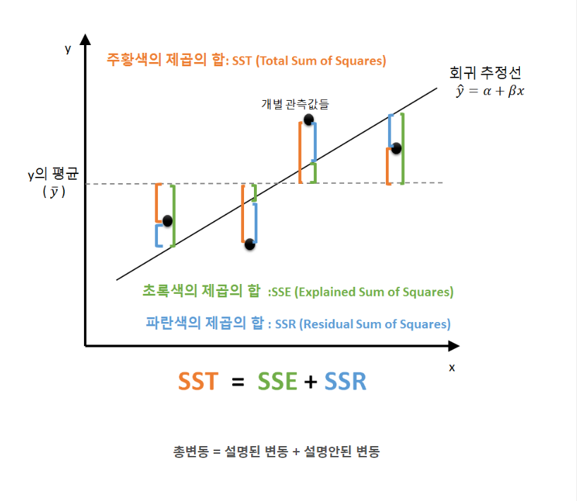 # R-squared : 0.588 (결정계수, 설명력) x가 종속변수 y의 분산을 설명하는 비율(0~1), 종속변수의 전체 분산으로 설명된 분산(종속변수가 독립변수의 영향을 받은 설명력)을 나눈 값