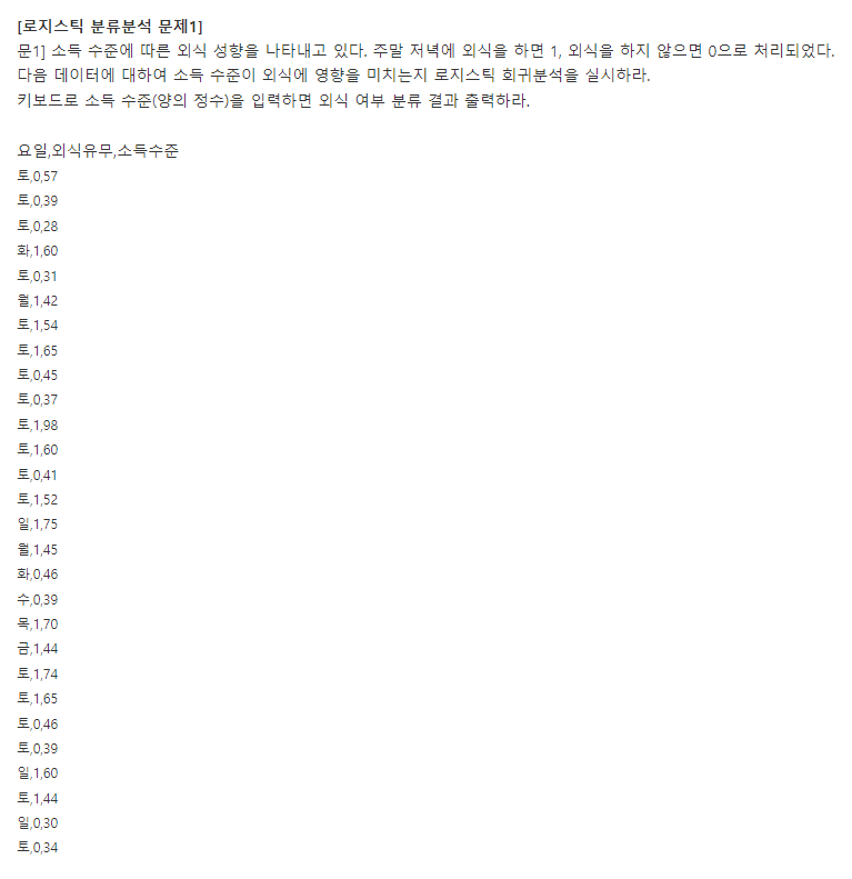 # 다음 데이터에 대하여 소득 수준이 외식에 영향을 미치는지 로지스틱 회귀분석을 실시하라.