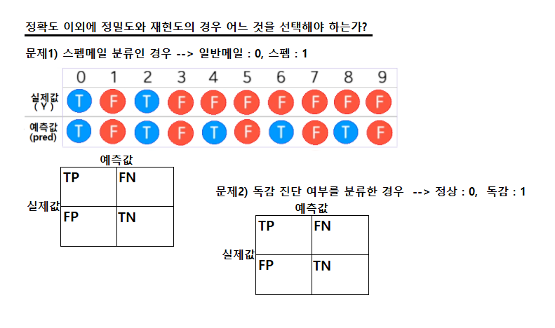 Accuracy(정확도)가 매우 중요하지만 데이터에 따라서 Precision, Recall도 매우 중요한 경우가 있다. 예제 3번 참고