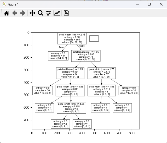 # Graphviz 모듈로 시각화 from sklearn import tree from io import StringIO import pydotplus dot_data = StringIO() # 파일 흉내를 내는 역할 tree.export_graphviz(mymodel, out_file = dot_data, feature_names = iris.feature_names[2:4]) graph = pydotplus.graph_from_dot_data(dot_data.getvalue()) graph.write_png('tree2.png') # 파일로 저장 # 이미지 읽기 from matplotlib.pyplot import imread import matplotlib.pyplot as plt img = imread('tree2.png') # 이미지 불러오기 plt.imshow(img) plt.show()위와 같은 식의 tree 시각화도 있다.