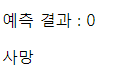<!DOCTYPE html> <html> <head> <meta charset="UTF-8"> <title>Insert title here</title> </head> <body> <p>예측 결과 : {{pred}}</p> {% if pred == 1 %} <p>생존</p> {% else %} <p>사망</p> {% endif %} </body> </html>