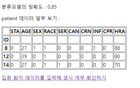 <!DOCTYPE html> <html> <head> <meta charset="UTF-8"> <title>Insert title here</title> </head> <body> <p>분류모델의 정확도 : {{acc}}</p> <p>patient 데이터 일부 보기 : {{df | safe}}</p> <a href="/show">입원 환자 데이터를 입력해 생사 여부 확인하기</a> </body> </html>