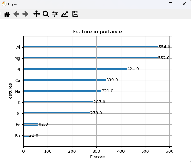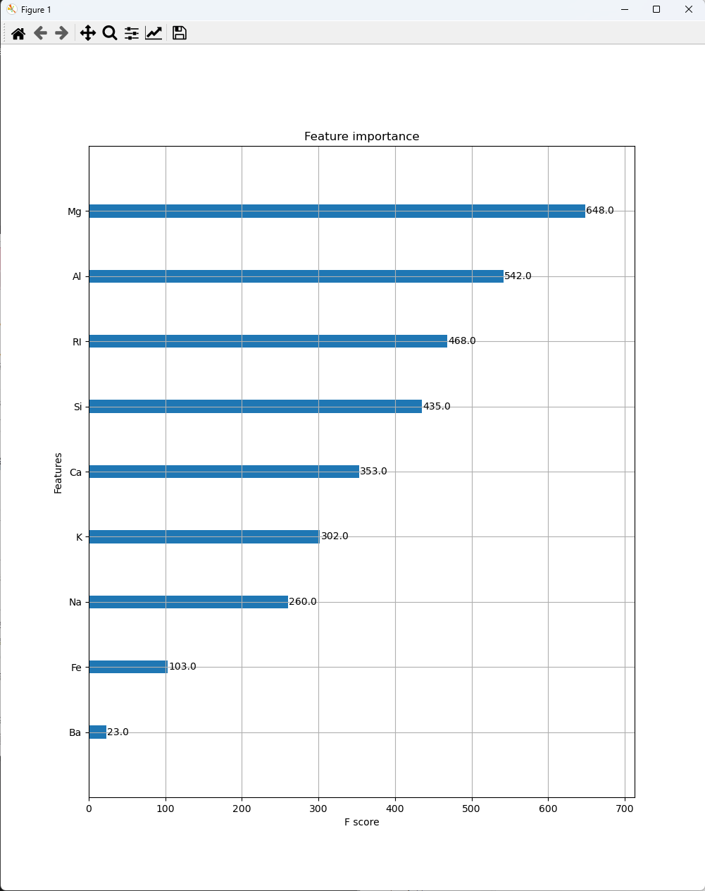 # [XGBoost 문제] # kaggle.com이 제공하는 'glass datasets' # 유리 식별 데이터베이스로 여러 가지 특징들에 의해 7 가지의 label(Type)로 분리된다. # # RI Na Mg Al Si K Ca Ba Fe Type # ... # glass.csv 파일을 읽어 분류 작업을 수행하시오. import numpy as np import pandas as pd from sklearn.model_selection import train_test_split import matplotlib.pyplot as plt import xgboost as xgb from xgboost import plot_importance df = pd.read_csv('../testdata/glass.csv') print(df.head(3), df.shape) # (214, 10) print(df.info()) print(df.describe()) print(df.corr()) df_x = df.drop(columns = ['Type']) df_y = df['Type'] from sklearn.preprocessing import LabelEncoder le = LabelEncoder() df_y = le.fit_transform(df_y) # train / test split x_train, x_test, y_train, y_test = train_test_split(df_x, df_y, test_size = 0.2, random_state = 12) print(x_train.shape, x_test.shape, y_train.shape, y_test.shape) # (171, 9) (43, 9) (171,) (43,) # model model = xgb.XGBClassifier(booster = 'gbtree', max_depth = 6, n_estimators = 500).fit(x_train, y_train) # 의사결정 기반(booster) pred = model.predict(x_test) print('예측값 :', pred[:10]) print('실제값 :', y_test[:10]) print('정확도 확인 방법 1') from sklearn import metrics acc = metrics.accuracy_score(y_test, pred) print('acc :', acc) # 중요 변수 시각화 fig, ax = plt.subplots(figsize=(10, 12)) plot_importance(model, ax = ax) plt.show() <console> RI Na Mg Al Si K Ca Ba Fe Type 0 1.52101 13.64 4.49 1.10 71.78 0.06 8.75 0.0 0.0 1 1 1.51761 13.89 3.60 1.36 72.73 0.48 7.83 0.0 0.0 1 2 1.51618 13.53 3.55 1.54 72.99 0.39 7.78 0.0 0.0 1 (214, 10) <class 'pandas.core.frame.DataFrame'> RangeIndex: 214 entries, 0 to 213 Data columns (total 10 columns): # Column Non-Null Count Dtype --- ------ -------------- ----- 0 RI 214 non-null float64 1 Na 214 non-null float64 2 Mg 214 non-null float64 3 Al 214 non-null float64 4 Si 214 non-null float64 5 K 214 non-null float64 6 Ca 214 non-null float64 7 Ba 214 non-null float64 8 Fe 214 non-null float64 9 Type 214 non-null int64 dtypes: float64(9), int64(1) memory usage: 16.8 KB None RI Na Mg ... Ba Fe Type count 214.000000 214.000000 214.000000 ... 214.000000 214.000000 214.000000 mean 1.518365 13.407850 2.684533 ... 0.175047 0.057009 2.780374 std 0.003037 0.816604 1.442408 ... 0.497219 0.097439 2.103739 min 1.511150 10.730000 0.000000 ... 0.000000 0.000000 1.000000 25% 1.516522 12.907500 2.115000 ... 0.000000 0.000000 1.000000 50% 1.517680 13.300000 3.480000 ... 0.000000 0.000000 2.000000 75% 1.519157 13.825000 3.600000 ... 0.000000 0.100000 3.000000 max 1.533930 17.380000 4.490000 ... 3.150000 0.510000 7.000000 [8 rows x 10 columns] RI Na Mg ... Ba Fe Type RI 1.000000 -0.191885 -0.122274 ... -0.000386 0.143010 -0.164237 Na -0.191885 1.000000 -0.273732 ... 0.326603 -0.241346 0.502898 Mg -0.122274 -0.273732 1.000000 ... -0.492262 0.083060 -0.744993 Al -0.407326 0.156794 -0.481799 ... 0.479404 -0.074402 0.598829 Si -0.542052 -0.069809 -0.165927 ... -0.102151 -0.094201 0.151565 K -0.289833 -0.266087 0.005396 ... -0.042618 -0.007719 -0.010054 Ca 0.810403 -0.275442 -0.443750 ... -0.112841 0.124968 0.000952 Ba -0.000386 0.326603 -0.492262 ... 1.000000 -0.058692 0.575161 Fe 0.143010 -0.241346 0.083060 ... -0.058692 1.000000 -0.188278 Type -0.164237 0.502898 -0.744993 ... 0.575161 -0.188278 1.000000 [10 rows x 10 columns] (171, 9) (43, 9) (171,) (43,) 예측값 : [1 1 1 0 5 1 2 5 0 0] 실제값 : [1 1 4 0 5 4 2 5 0 0] 정확도 확인 방법 1 acc : 0.8837209302325582