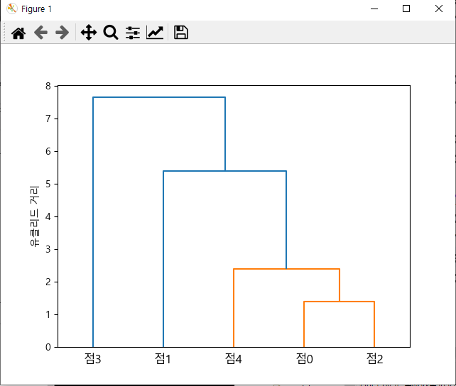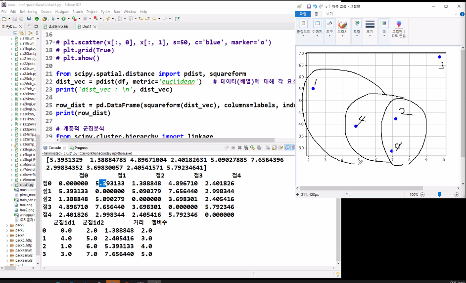 # Clustering(군집화) : 사전정보(label)가 없는 자료에 대해 컴퓨터 스스로가 패턴을 찾아 여러 개의 군집을 형성함. # 비지도학습 import pandas as pd import numpy as np import matplotlib.pyplot as plt plt.rc('font', family = 'malgun gothic') np.random.seed(123) var = ['x', 'y'] labels = ['점0', '점1', '점2', '점3', '점4'] x = np.random.random_sample([5, 2]) * 10 # print(x) df = pd.DataFrame(x, columns=var, index=labels) print(df) # plt.scatter(x[:, 0], x[:, 1], s=50, c='blue', marker='o') # plt.grid(True) # plt.show() from scipy.spatial.distance import pdist, squareform dist_vec = pdist(df, metric='euclidean') # 데이터(배열)에 대해 각 요소간 거리를 계산한 후 1차원 배열로 반환 print('dist_vec : \n', dist_vec) row_dist = pd.DataFrame(squareform(dist_vec), columns = labels, index = labels) print(row_dist) # squareform을 활용하여 데이터 프레임으로 넣어주면 보기 편하다. # 계층적 군집분석 from scipy.cluster.hierarchy import linkage row_clusters = linkage(dist_vec, method='complete') # linkage 안에는 데이터 간의 거리 데이터를 넣는다. df = pd.DataFrame(row_clusters, columns=['군집id1', '군집id2', '거리', '멤버수']) print(df) # dendrogram으로 row_clusters를 시각화 from scipy.cluster.hierarchy import dendrogram low_dend = dendrogram(row_clusters, labels = labels) plt.ylabel('유클리드 거리') plt.show() <console> x y 점0 6.964692 2.861393 점1 2.268515 5.513148 점2 7.194690 4.231065 점3 9.807642 6.848297 점4 4.809319 3.921175 dist_vec : [5.3931329 1.38884785 4.89671004 2.40182631 5.09027885 7.6564396 2.99834352 3.69830057 2.40541571 5.79234641] 점0 점1 점2 점3 점4 점0 0.000000 5.393133 1.388848 4.896710 2.401826 점1 5.393133 0.000000 5.090279 7.656440 2.998344 점2 1.388848 5.090279 0.000000 3.698301 2.405416 점3 4.896710 7.656440 3.698301 0.000000 5.792346 점4 2.401826 2.998344 2.405416 5.792346 0.000000 군집id1 군집id2 거리 멤버수 0 0.0 2.0 1.388848 2.0 1 4.0 5.0 2.405416 3.0 2 1.0 6.0 5.393133 4.0 3 3.0 7.0 7.656440 5.0