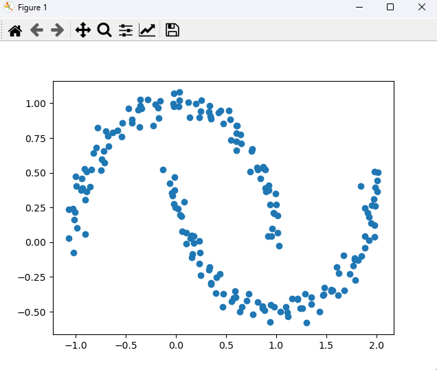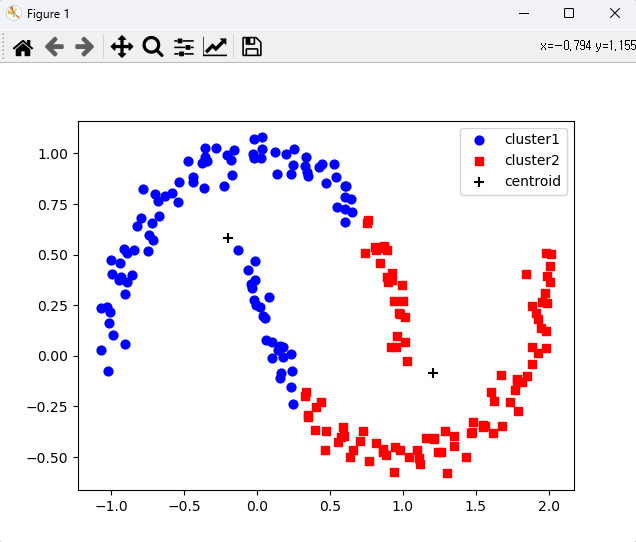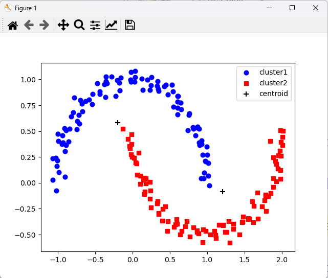 # 밀도 기반 클러스터링 : 데이터가 비선형인 경우 일반적인 계층적/비계층적 클러스터링이 불가. 이를 해결하기 위한 방안. import matplotlib.pylab as plt from matplotlib import style import numpy as np from sklearn.datasets import make_moons from sklearn.cluster import KMeans, DBSCAN # 샘플 데이터 x, y = make_moons(n_samples=200, noise=0.05, random_state=0) print(x) print('실제 군집 id :', set(y)) # plt.scatter(x[:, 0], x[:, 1]) # plt.show() # KMeans로 군집 분류 km = KMeans(n_clusters=2, random_state=0) pred1 = km.fit_predict(x) print('예측 군집 id :', pred1[:10]) print('예측 군집 id :', set(pred1)) # Kmeans 군집결과 시각화 def plotFunc(x, pr): plt.scatter(x[pr==0, 0], x[pr==0, 1], s=40, c='blue', marker='o', label='cluster1') plt.scatter(x[pr==1, 0], x[pr==1, 1], s=40, c='red', marker='s', label='cluster2') plt.scatter(km.cluster_centers_[:,0], km.cluster_centers_[:,1], s=60, c='black', marker='+', label='centroid') plt.legend() plt.show() plotFunc(x, pred1) # 완전한 분리가 완 된다. # DBSCAN으로 군집 분류 ds = DBSCAN(eps=0.2, min_samples=5, metric='euclidean') # eps : 두 샘플간의 최대거리 pred2 = ds.fit_predict(x) plotFunc(x, pred2) <console> [[ 0.81680544 0.5216447 ] [ 1.61859642 -0.37982927] [-0.02126953 0.27372826] [-1.02181041 -0.07543984] [ 1.76654633 -0.17069874] [ 1.8820287 -0.04238449] [ 0.97481551 0.20999374] [ 0.88798782 -0.48936735] [ 0.89865156 0.36637762] [ 1.11638974 -0.53460385] [-0.36380036 0.82790185] [ 0.24702417 -0.23856676] [ 1.81658658 -0.13088387] [ 1.2163905 -0.40685761] [-0.8236696 0.64235178] [ 0.98065583 0.20850838] [ 0.54097175 0.88616823] [ 0.348031 -0.30101351] [ 0.35181497 0.88827765] [-0.77708642 0.82253872] [ 1.92590813 0.01214146] [ 0.86096723 -0.47653216] [ 0.19990695 0.99672359] [ 1.2895301 -0.37071087] [-0.27847636 1.02538452] [ 0.24187916 -0.07627812] [ 1.84988768 -0.09773674] [ 1.88406869 0.0449402 ] [ 0.165822 -0.08613126] [ 0.13861369 0.89639036] [ 0.89087024 0.52265882] [-0.22806587 0.84091882] [ 0.98279208 -0.46457771] [ 0.04237749 0.19457898] [ 0.76422612 0.67223332] [ 1.91108938 0.21178339] [ 0.43608432 -0.23007221] [ 0.96186938 0.09923426] [-0.84336684 0.52414334] [-0.04122466 0.35721873] [ 0.55507653 -0.42493298] [-0.4388286 0.85940389] [ 0.6532646 0.71235382] [ 0.10274835 0.06721414] [ 1.5486824 -0.34012196] [-0.37318371 0.95506411] [ 1.01706978 0.19210044] [-0.71923685 0.65476676] [ 0.16135772 -0.10771978] [ 0.86434045 -0.4594568 ] [-0.69717533 0.80133734] [ 0.32791175 -0.19619019] [ 1.98046734 0.03848682] [-0.90479784 0.05723938] [ 1.04515397 -0.50020349] [ 0.7534213 0.65688005] [ 0.54968577 0.73635744] [ 1.24038086 -0.47577903] [ 0.24918868 0.94246199] [-0.20756105 0.99290594] [ 0.35136403 -0.29065432] [-1.01628753 0.16290244] [ 1.78137056 -0.1244931 ] [ 0.87423825 0.53065346] [ 1.09997644 -0.46733763] [-1.07022744 0.2365448 ] [-0.15869858 1.01497482] [ 1.46569247 -0.3808977 ] [ 0.03025209 0.97792142] [-0.9365943 0.45674926] [ 0.66038307 -0.46576222] [-0.99144728 0.40662094] [ 0.46339847 -0.46605416] [-0.132006 0.52447234] [ 0.81566997 -0.42821617] [-0.94820947 0.37717096] [ 0.05300205 0.18597406] [ 0.92648634 0.40988975] [ 0.60689997 0.78279323] [ 0.72961391 -0.37215252] [ 1.9796026 0.12425417] [-0.02053902 0.97601558] [ 0.63818364 -0.49916763] [ 2.00639179 0.44597642] [ 0.02315539 0.24035667] [-0.35883877 1.02716833] [ 0.95414653 0.04177433] [-0.33921532 0.96308888] [ 0.59950492 -0.39774852] [ 1.99019644 0.39360049] [ 0.33125729 0.9365782 ] [ 0.99460422 0.35063363] [ 1.98845457 0.2628361 ] [-0.67473718 0.76419738] [ 2.00751107 0.3651166 ] [ 1.78298331 -0.11490401] [ 1.73616653 -0.22781554] [ 0.40646216 -0.25422904] [-1.02505346 0.24337404] [ 0.06414296 0.07759793] [ 1.30092145 -0.58089757] [ 1.97425572 0.30889897] [ 0.03228388 1.07937745] [ 1.03086156 -0.02389082] [-0.90062492 0.30653639] [ 0.08068561 0.29131373] [-0.98807765 0.1039765 ] [-0.47394435 0.96143212] [ 1.54651932 -0.35008497] [ 0.23332453 0.89648984] [-0.58481687 0.80318956] [ 0.0374878 1.02322111] [-0.01943215 1.07001032] [-0.85323667 0.39896937] [ 0.92635535 0.37695326] [ 1.43250553 -0.50148981] [ 0.60622756 0.66229531] [ 1.94401554 0.13685573] [ 0.57984414 -0.39868907] [ 0.74317519 0.50998316] [ 0.87116686 0.54105191] [-0.71045745 0.57281877] [-0.03081568 0.33644614] [-0.0298505 0.99553114] [-0.06313347 0.42194174] [-0.79223214 0.68354165] [ 0.92098434 0.04171051] [ 0.17794377 0.04536893] [ 1.34934828 -0.3941652 ] [ 1.98387143 0.50898445] [ 1.00104892 0.27158454] [-0.5425424 0.76257612] [-0.9969011 0.47226403] [ 0.23408511 -0.15381658] [ 1.21437019 -0.40862022] [ 1.60101745 -0.17940652] [ 1.15844202 -0.40408591] [-1.00922523 0.2161359 ] [ 2.01865957 0.50313426] [ 0.88839866 0.39017093] [ 0.10170896 -0.01206481] [-0.01241966 0.47064905] [ 0.44566504 0.94595998] [-0.3569344 0.98319206] [-0.43845037 0.88374167] [ 1.01534178 0.06687469] [ 0.2310607 0.01153495] [ 1.35098772 -0.44520507] [ 0.25423421 1.0205525 ] [-0.00586456 0.24919627] [ 0.4752852 -0.37028432] [ 1.68071768 -0.34775296] [ 0.84564282 0.45629647] [ 0.34218757 0.90613948] [ 0.58741368 -0.35078742] [-0.17818292 0.96641541] [ 1.25865528 -0.4740009 ] [ 0.33542814 -0.18023343] [ 0.52630774 0.94876068] [ 0.6424051 0.77717105] [ 0.15770292 0.04709417] [ 1.11178863 -0.5065278 ] [ 0.60370903 0.83759912] [ 1.48247118 -0.32721961] [ 0.39793421 -0.36876588] [ 1.67240934 -0.09328043] [ 0.47551295 0.85547255] [ 0.70605116 -0.42241887] [ 1.56418943 -0.34860626] [ 0.94012854 -0.57508877] [ 0.61400301 0.83833823] [-1.07139757 0.02669316] [-0.91308996 0.52626435] [-0.74824469 0.51823742] [ 0.14688241 0.0297201 ] [ 0.94362014 -0.44829425] [ 1.84489829 0.40601924] [-0.66827347 0.69085682] [-0.7362418 0.59951884] [ 0.60146482 0.72551706] [ 1.47437703 -0.37541022] [-0.88760005 0.50864517] [ 1.92892164 0.18201791] [ 1.78673422 -0.27470711] [ 1.95130228 0.26574549] [ 0.33471666 0.98057089] [-0.16884749 0.89206411] [ 0.77063994 -0.51750338] [-