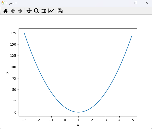 # 모델의 정확도가 높을수록 비용함수 값은 낮아진다. import numpy as na import math real = [10, 9, 3, 2, 11] # y 실제값 pred = [11, 5, 2, 4, 3] # y 예측값(모델에 의해 얻어진 값이라 가정) cost = 0 for i in range(5): cost += math.pow(pred[i] - real[i], 2) # 거듭제곱 print(cost) print('cost :', cost / len(pred)) print() real = [10, 9, 3, 2, 11] # y 실제값 pred = [11, 8, 4, 3, 11] # y 예측값(모델에 의해 얻어진 값이라 가정) cost = 0 for i in range(5): cost += math.pow(pred[i] - real[i], 2) # pow() 함수는 y의 거듭제곱에 대한 x의 값을 계산합니다. print(cost) print('cost :', cost / len(pred)) print('-----------') # 가중치(W, weight)와 비용함수(cost function, loss, 손실, 비용)의 변화 값을 시각화 import tensorflow as tf import matplotlib.pyplot as plt x = [1,2,3,4,5] y = [1,2,3,4,5] b = 0 # hypothesis = x * w + b # cost = tf.reduce_sum(tf.pow(hypothesis - y, 2)) / len(x) # reduce_sum은 합을 구한 뒤 차원을 떨어트린다. # 비용 함수 = 예측값 - 실제값에 제곱을 하고 그 합에 대한 평균 w_val = [] cost_val = [] for i in range(-30, 50): feed_w = i * 0.1 # 0.1은 학습률(기울기) # print(feed_w) hypothesis = tf.multiply(feed_w, x) + b # 예측값 cost = tf.reduce_mean(tf.square(hypothesis - y)) cost_val.append(cost) w_val.append(feed_w) print(str(i) + ' ' + ', cost :' + str(cost.numpy()) + ', weight :' + str(feed_w)) plt.plot(w_val, cost_val) plt.xlabel('w') plt.ylabel('y') plt.show() <console> 1.0 17.0 18.0 22.0 86.0 cost : 17.2 1.0 2.0 3.0 4.0 4.0 cost : 0.8 ----------- 2022-11-29 16:23:57.775615: I tensorflow/core/platform/cpu_feature_guard.cc:193] This TensorFlow binary is optimized with oneAPI Deep Neural Network Library (oneDNN) to use the following CPU instructions in performance-critical operations: AVX AVX2 To enable them in other operations, rebuild TensorFlow with the appropriate compiler flags. -30 , cost :176.0, weight :-3.0 -29 , cost :167.31001, weight :-2.9000000000000004 -28 , cost :158.84, weight :-2.8000000000000003 -27 , cost :150.59, weight :-2.7 -26 , cost :142.55998, weight :-2.6 -25 , cost :134.75, weight :-2.5 -24 , cost :127.16001, weight :-2.4000000000000004 -23 , cost :119.78999, weight :-2.3000000000000003 -22 , cost :112.64, weight :-2.2 -21 , cost :105.71, weight :-2.1 -20 , cost :99.0, weight :-2.0 -19 , cost :92.51, weight :-1.9000000000000001 -18 , cost :86.24, weight :-1.8 -17 , cost :80.19, weight :-1.7000000000000002 -16 , cost :74.36, weight :-1.6 -15 , cost :68.75, weight :-1.5 -14 , cost :63.359997, weight :-1.4000000000000001 -13 , cost :58.190002, weight :-1.3 -12 , cost :53.24, weight :-1.2000000000000002 -11 , cost :48.51, weight :-1.1 -10 , cost :44.0, weight :-1.0 -9 , cost :39.71, weight :-0.9 -8 , cost :35.64, weight :-0.8 -7 , cost :31.789999, weight :-0.7000000000000001 -6 , cost :28.16, weight :-0.6000000000000001 -5 , cost :24.75, weight :-0.5 -4 , cost :21.56, weight :-0.4 -3 , cost :18.59, weight :-0.30000000000000004 -2 , cost :15.839999, weight :-0.2 -1 , cost :13.31, weight :-0.1 0 , cost :11.0, weight :0.0 1 , cost :8.91, weight :0.1 2 , cost :7.04, weight :0.2 3 , cost :5.39, weight :0.30000000000000004 4 , cost :3.9599998, weight :0.4 5 , cost :2.75, weight :0.5 6 , cost :1.7599999, weight :0.6000000000000001 7 , cost :0.99000007, weight :0.7000000000000001 8 , cost :0.43999997, weight :0.8 9 , cost :0.11000004, weight :0.9 10 , cost :0.0, weight :1.0 11 , cost :0.11000004, weight :1.1 12 , cost :0.44000012, weight :1.2000000000000002 13 , cost :0.9899999, weight :1.3 14 , cost :1.7599999, weight :1.4000000000000001 15 , cost :2.75, weight :1.5 16 , cost :3.9600003, weight :1.6 17 , cost :5.3900003, weight :1.7000000000000002 18 , cost :7.0399995, weight :1.8 19 , cost :8.909999, weight :1.9000000000000001 20 , cost :11.0, weight :2.0 21 , cost :13.309999, weight :2.1 22 , cost :15.840001, weight :2.2 23 , cost :18.59, weight :2.3000000000000003 24 , cost :21.560001, weight :2.4000000000000004 25 , cost :24.75, weight :2.5 26 , cost :28.159998, weight :2.6 27 , cost :31.790003, weight :2.7 28 , cost :35.639996, weight :2.8000000000000003 29 , cost :39.710003, weight :2.9000000000000004 30 , cost :44.0, weight :3.0 31 , cost :48.51, weight :3.1 32 , cost :53.24, weight :3.2 33 , cost :58.190002, weight :3.3000000000000003 34 , cost :63.360004, weight :3.4000000000000004 35 , cost :68.75, weight :3.5 36 , cost :74.36, weight :3.6 37 , cost :80.19, weight :3.7 38 , cost :86.24, weight :3.8000000000000003 39 , cost :92.51, weight :3.9000000000000004 40 , cost :99.0, weight :4.0 41 , cost :105.71, weight :4.1000000000000005 42 , cost :112.63999, weight :4.2 43 , cost :119.79, weight :4.3 44 , cost :127.16001, weight :4.4 45 , cost :134.75, weight :4.5 46 , cost :142.55998, weight :4.6000000000000005 47 , cost :150.59, weight :4.7 48 , cost :158.84, weight :4.800000000000001 49 , cost :167.31001, weight :4.9위와 같은 원리로 cost와 w(기울기)값을 구할 수 있다.