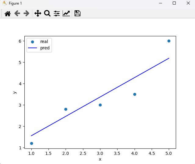 # 선형회귀 모형 작성 : 수식 사용 # tensorflow 사용 import tensorflow as tf import numpy as np from keras.optimizers import SGD, RMSprop, Adam x = [1., 2., 3., 4., 5.] y = [1.2, 2.8, 3.0, 3.5, 6.0] print(np.corrcoef(x, y)) # 상관계수(r) = 0.937 # 인과 관계가 있다 가정하고 회귀분석 작업을 진행 tf.random.set_seed(123) w = tf.Variable(tf.random.normal((1,))) b = tf.Variable(tf.random.normal((1,))) print(w.numpy(), ' ', b.numpy()) # 선형회귀식을 얻기 위해 cost를 줄여가는 작업 opti = SGD() @tf.function def train_func(x, y): with tf.GradientTape() as tape: hypo = tf.add(tf.multiply(w, x), b) # y = wx + b, 예측값 loss = tf.reduce_mean(tf.square(tf.subtract(hypo, y))) # subtract 빼기 함수 grad = tape.gradient(loss, [w, b]) # 자동 미분을 해 줌 opti.apply_gradients(zip(grad, [w, b])) return loss w_vals = [] cost_vals = [] for i in range(1, 101): # epochs loss_val = train_func(x, y) cost_vals.append(loss_val.numpy()) w_vals.append(w.numpy()) if i % 10 == 0: # 10의 배수일 경우에만 출력 print(loss_val) print('cost :', cost_vals) print('w :', w_vals) print() # w, cost를 시각화 import matplotlib.pyplot as plt plt.plot(w_vals, cost_vals, 'o--') plt.xlabel('w') plt.ylabel('cost') plt.show() print('cost가 최소일 때 w :', w.numpy()) print('cost가 최소일 때 b :', b.numpy()) # yhat = 0.90847826 * x + 0.6487321 # 선형회귀식으로 시각화 y_pred = tf.multiply(x, w) + b print('y_pred :', y_pred) print('y :', y) plt.scatter(x, y, label='real') plt.plot(x, y_pred, 'b-', label='pred') plt.xlabel('x') plt.ylabel('y') plt.legend() plt.show() print() # 새 값으로 정량적 예측 new_x = [3.5, 9.7] new_pred = tf.multiply(new_x, w) + b print('예측값 :', new_pred.numpy()) <console> [[1. 0.93713845] [0.93713845 1. ]] [-0.8980837] [0.33875433] tf.Tensor(0.664091, shape=(), dtype=float32) tf.Tensor(0.35622105, shape=(), dtype=float32) tf.Tensor(0.35087812, shape=(), dtype=float32) tf.Tensor(0.34716052, shape=(), dtype=float32) tf.Tensor(0.34369203, shape=(), dtype=float32) tf.Tensor(0.34045076, shape=(), dtype=float32) tf.Tensor(0.3374218, shape=(), dtype=float32) tf.Tensor(0.3345912, shape=(), dtype=float32) tf.Tensor(0.33194596, shape=(), dtype=float32) tf.Tensor(0.32947397, shape=(), dtype=float32) cost : [39.713856, 23.294338, 13.725664, 8.149324, 4.899521, 3.0055096, 1.9015872, 1.2580913, 0.88291013, 0.664091, 0.5363928, 0.46179694, 0.4181475, 0.39253327, 0.37743038, 0.36845425, 0.36304945, 0.3597273, 0.35761958, 0.35622105, 0.35523695, 0.35449535, 0.35389638, 0.35338143, 0.35291666, 0.35248226, 0.3520667, 0.35166317, 0.35126784, 0.35087812, 0.35049295, 0.35011154, 0.34973326, 0.34935778, 0.34898525, 0.34861523, 0.3482477, 0.3478829, 0.3475204, 0.34716052, 0.34680304, 0.3464479, 0.3460952, 0.3457449, 0.34539694, 0.34505135, 0.34470809, 0.3443671, 0.34402838, 0.34369203, 0.34335798, 0.34302616, 0.34269652, 0.34236914, 0.34204403, 0.34172112, 0.3414003, 0.34108162, 0.34076506, 0.34045076, 0.3401385, 0.3398285, 0.33952048, 0.33921456, 0.33891064, 0.3386088, 0.33830896, 0.33801132, 0.33771548, 0.3374218, 0.33712998, 0.33684015, 0.33655232, 0.33626643, 0.33598256, 0.33570048, 0.3354203, 0.33514208, 0.33486572, 0.3345912, 0.3343185, 0.3340477, 0.3337787, 0.33351144, 0.33324623, 0.33298248, 0.3327208, 0.33246067, 0.33220252, 0.33194596, 0.33169118, 0.33143792, 0.3311866, 0.33093697, 0.33068895, 0.3304426, 0.33019796, 0.32995504, 0.32971364, 0.32947397] w : [array([-0.48163053], dtype=float32), array([-0.1635837], dtype=float32), array([0.07934122], dtype=float32), array([0.26491904], dtype=float32), array([0.4067187], dtype=float32), array([0.5150985], dtype=float32), array([0.5979658], dtype=float32), array([0.6613568], dtype=float32), array([0.70987964], dtype=float32), array([0.7470519], dtype=float32), array([0.7755589], dtype=float32), array([0.7974506], dtype=float32), array([0.81429183], dtype=float32), array([0.82727724], dtype=float32), array([0.8373187], dtype=float32), array([0.8451124], dtype=float32), array([0.85118973], dtype=float32), array([0.85595644], dtype=float32), array([0.8597222], dtype=float32), array([0.86272335], dtype=float32), array([0.8651405], dtype=float32), array([0.8671113], dtype=float32), array([0.86874104], dtype=float32), array([0.8701099], dtype=float32), array([0.8712793], dtype=float32), array([0.8722959], dtype=float32), array([0.8731955], dtype=float32), array([0.87400544], dtype=float32), array([0.8747464], dtype=float32), array([0.8754343], dtype=float32), array([0.8760813], dtype=float32), array([0.8766967], dtype=float32), array([0.87728757], dtype=float32), array([0.87785923], dtype=float32), array([0.8784159], dtype=float32), array([0.87896067], dtype=float32), array([0.8794959], dtype=float32), array([0.88002354], dtype=float32), array([0.88054496], dtype=float32), array([0.8810612], dtype=float32), array([0.88157314], dtype=float32), array([0.88208133], dtype=float32), array([0.8825863], dtype=float32), array([0.8830884], dtype=float32), array([0.88358796], dtype=float32), array([0.8840851], dtype=float32), array([0.88458014], dtype=float32), array([0.88507307], dtype=float32), array([0.885564], dtype=float32), array([0.8860531], dtype=float32), array([0.88654035], dtype=float32), array([0.88702583], dtype=float32), array([0.8875095], dtype=float32), array([0.88799155], dtype=float32), array([0.88847184], dtype=float32), array([0.88895047], dtype=float32), array([0.8894275], dtype=float32), array([0.88990283], dtype=float32), array([0.89037657], dtype=float32), array([0.8908487], dtype=float32), array([0.8913192], dtype=float32), array([0.8917881], dtype=float32), array([0.8922554], dtype=float32), array([0.8927212], dtype=float32), array([0.8931853], dtype=float32), array([0.8936479], dtype=float32), array([0.8941089], dtype=float32), array([0.8945683], dtype=float32), array([0.8950262], dtype=float32), array([0.89548254], dtype=float32), array([0.8959373], dtype=float32