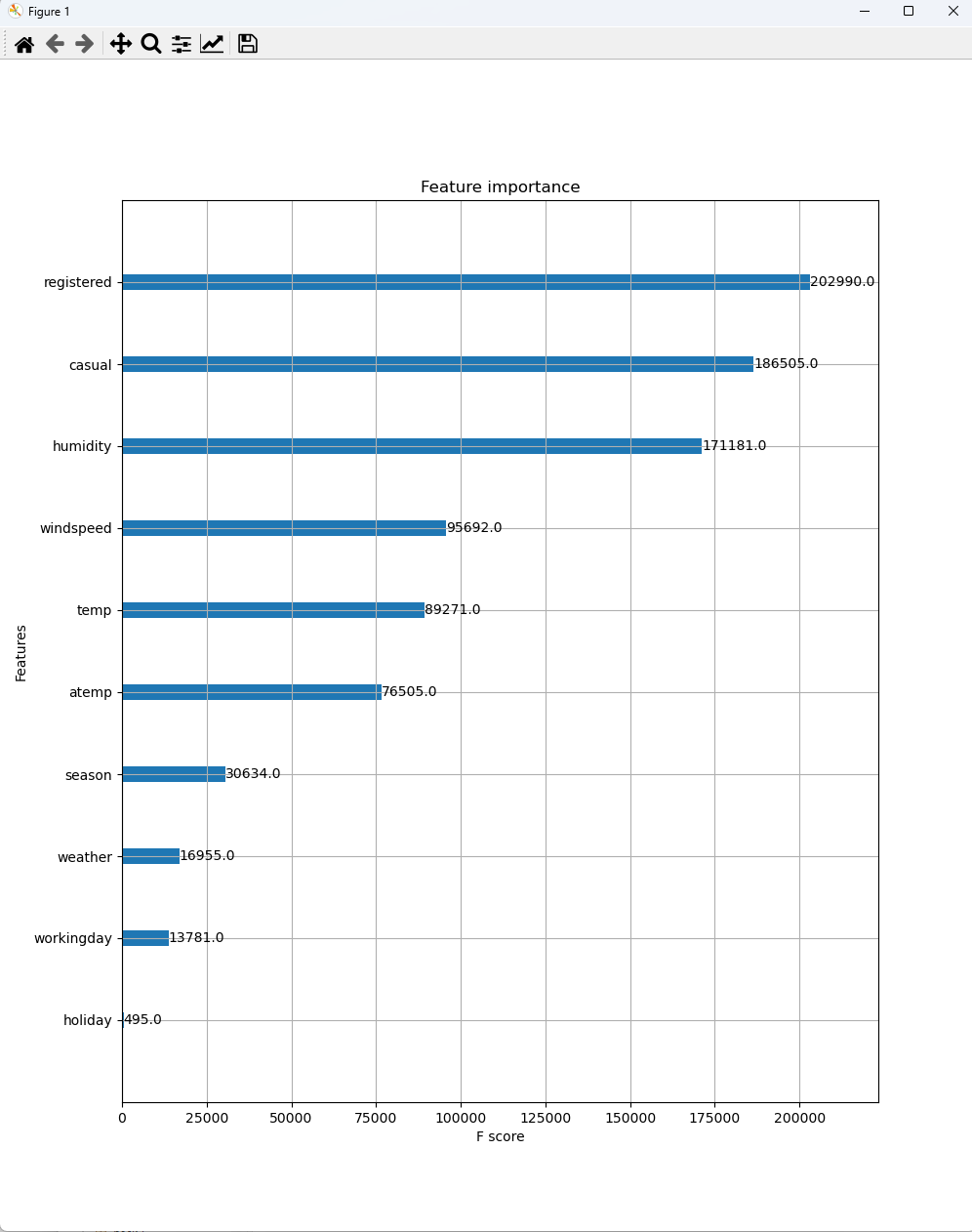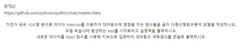 # 문제2) # https://github.com/pykwon/python/tree/master/data # 자전거 공유 시스템 분석용 데이터 train.csv를 이용하여 대여횟수에 영향을 주는 변수들을 골라 다중선형회귀분석 모델을 작성하시오. # 모델 학습시에 발생하는 loss를 시각화하고 설명력을 출력하시오. # 새로운 데이터를 input 함수를 사용해 키보드로 입력하여 대여횟수 예측결과를 콘솔로 출력하시오. import pandas as pd from keras.models import Sequential from keras.layers import Dense import matplotlib.pyplot as plt from sklearn.model_selection import train_test_split from xgboost import plot_importance import xgboost as xgb from sklearn.metrics import r2_score from sklearn.preprocessing import MinMaxScaler df = pd.read_csv('https://raw.githubusercontent.com/pykwon/python/master/data/train.csv') print(df.head(3)) # print(df.isnull().sum()) # 널값없음 x = df.drop(['count', 'datetime'], axis=1) # print(x[:3]) y = df['count'] # print(y[:3]) from sklearn.preprocessing import LabelEncoder le = LabelEncoder() y = le.fit_transform(y) # XGBClassifier로 중요 변수 뽑아내기 model = xgb.XGBClassifier(booster = 'gbtree', max_depth = 6, n_estimators=500 ).fit(x, y) fig, ax = plt.subplots(figsize = (10, 12)) plot_importance(model, ax = ax) plt.show() features = df[['registered', 'casual', 'humidity', 'windspeed', 'temp']] # 중요변수 따로 뽑아서 담아줌 x_train, x_test, y_train, y_test = train_test_split(features, y, test_size = 0.3) print(x_train.shape, x_test.shape, y_train.shape, y_test.shape) # (7620, 5) (3266, 5) (7620,) (3266,) #모델 작성 scaler=MinMaxScaler(feature_range=(0,1)) features=scaler.fit_transform(features) x_train, x_test, y_train,y_test=train_test_split(features, y, test_size=0.3) # print(x_train.shape, x_test.shape, y_train.shape,y_test.shape) # (7620, 5) (3266, 5) (7620,) (3266,) model=Sequential() model.add(Dense(units=1, input_dim=5, activation='linear')) model.compile(optimizer='sgd', loss='mse', metrics=['mse']) history=model.fit(x_train, y_train, epochs=15, verbose=0, validation_split=0.15) print(history.history['loss']) #시각화 plt.plot(history.history['loss'], label='train loss') plt.xlabel('epochs') plt.show() #설명계수 pred=model.predict(x_test) print('설명력', r2_score(y_test, pred)) <console> datetime season holiday ... casual registered count 0 2011-01-01 00:00:00 1 0 ... 3 13 16 1 2011-01-01 01:00:00 1 0 ... 8 32 40 2 2011-01-01 02:00:00 1 0 ... 5 27 32 [3 rows x 12 columns] (7620, 5) (3266, 5) (7620,) (3266,) [28182.78125, 18007.283203125, 13020.318359375, 9664.0107421875, 7350.62841796875, 5717.56591796875, 4541.59912109375, 3670.263427734375, 3008.651611328125, 2491.644287109375, 2082.2470703125, 1751.3590087890625, 1482.5010986328125, 1260.165771484375, 1074.5880126953125] 1/103 [..............................] - ETA: 5s 85/103 [=======================>......] - ETA: 0s 103/103 [==============================] - 0s 592us/step 설명력 0.9680765313450331xgb를 import 하여 시각화로 중요변수를 알아보고 그것들을 꺼내여 train / test split 및 validation_split을 진행하여 모델을 설계하고 작성하였다.
