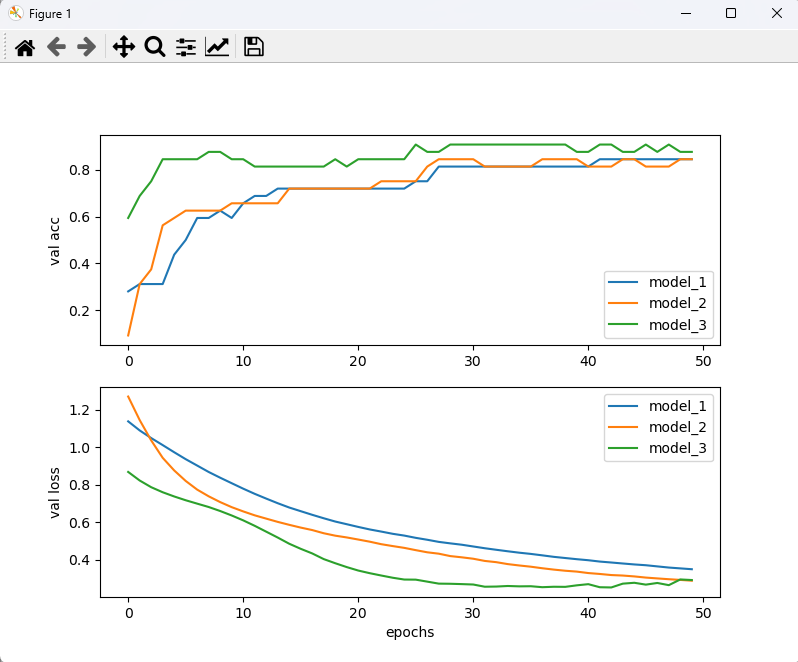 # iris dataset 분류 모델 여러개 생성 후 성능 비교. 최종 모델 ROC curve 표현 import numpy as np import matplotlib.pyplot as plt from sklearn.datasets import load_iris from sklearn.model_selection import train_test_split from sklearn.preprocessing import OneHotEncoder, StandardScaler iris = load_iris() print(iris.keys()) x = iris.data print(x[:2]) y = iris.target print(y[:2]) names = iris.target_names # 꽃의 종류명 print(names) # ['setosa' 'versicolor' 'virginica'] feature_names = iris.feature_names print(feature_names) # ['sepal length (cm)', 'sepal width (cm)', 'petal length (cm)', 'petal width (cm)'] # label에 대해 원핫 인코딩 print(y[:1], y.shape) # [0] (150,) onehot = OneHotEncoder(categories='auto') # keras : to_categorical, numpy : eye(), pandas : get_dummies() y = onehot.fit_transform(y[:, np.newaxis]).toarray() print(y[:1], y.shape) # [[1. 0. 0.]] (150, 3) # feature에 대해 표준화 scaler = StandardScaler() x_scaler = scaler.fit_transform(x) print(x_scaler[:2]) # train / test split x_train, x_test, y_train, y_test = train_test_split(x_scaler, y, test_size=0.3, random_state=1) n_features = x_train.shape[1] n_classes = y_train.shape[1] print('feature 수 : {}, label 수 : {}'.format(n_features, n_classes)) print('model') from keras.models import Sequential from keras.layers import Dense def create_model_func(input_dim, output_dim, out_nodes, n, model_name='model'): # parameter 값에 초기값을 줄 수 있다. # print(input_dim, output_dim, out_nodes, n, model_name) def create_model(): model = Sequential(name=model_name) for _ in range(n): model.add(Dense(units=out_nodes, input_dim=input_dim, activation='relu')) model.add(Dense(units=output_dim, activation='softmax')) # 출력층 model.compile(optimizer='adam', loss='categorical_crossentropy', metrics=['acc']) return model return create_model models = [create_model_func(n_features, n_classes, 10, n, 'model_{}'.format(n)) for n in range(1, 4)] print(len(models)) for cre_model in models: print() cre_model().summary() history_dict = {} for cre_model in models: model = cre_model() print('모델명 :', model.name) historis = model.fit(x_train, y_train, batch_size=5, epochs=50, validation_split=0.3, verbose=0) score = model.evaluate(x_test, y_test, verbose=0) print('test loss :', score[0]) print('test acc :', score[1]) history_dict[model.name] = [historis, model] print(history_dict) # 모델 성능 확인을 위한 시각화 fig, (ax1, ax2) = plt.subplots(2, 1, figsize=(8, 6)) for model_name in history_dict: print('h_d :', history_dict[model_name][0].history['acc']) val_acc = history_dict[model_name][0].history['val_acc'] val_loss = history_dict[model_name][0].history['val_loss'] ax1.plot(val_acc, label=model_name) ax2.plot(val_loss, label=model_name) ax1.set_ylabel('val acc') ax2.set_ylabel('val loss') ax2.set_ylabel('val loss') ax2.set_xlabel('epochs') ax1.legend() ax2.legend() plt.show() # ROC curve로 모델 성능 확인 from sklearn.metrics import roc_curve, auc plt.figure() plt.plot([0, 1], [0, 1], 'k--') for model_name in history_dict: model = history_dict[model_name][1] y_pred = model.predict(x_test) # fpr, tpr 구하기 fpr, tpr, _ = roc_curve(y_test.ravel(), y_pred.ravel()) plt.plot(fpr, tpr, label='{}, AUC value : {:.3f}'.format(model_name, auc(fpr, tpr))) plt.xlabel('fpr') plt.ylabel('tpr') plt.title('ROC curve') plt.legend() plt.show() print() # k-fold 교차검증 수행하여 모델 성능 비교 from keras.wrappers.scikit_learn import KerasClassifier from sklearn.model_selection import cross_val_score create_model = create_model_func(n_features, n_classes, 10, 1) estimator = KerasClassifier(build_fn=create_model, epochs=50, batch_size=10, verbose=0) scores = cross_val_score(estimator, x_scaler, y, cv=10) print('acc : {:0.2f} (+/-{:0.2f})'.format(scores.mean(), scores.std())) create_model = create_model_func(n_features, n_classes, 10, 2) estimator = KerasClassifier(build_fn=create_model, epochs=50, batch_size=10, verbose=0) scores = cross_val_score(estimator, x_scaler, y, cv=10) print('acc2 : {:0.2f} (+/-{:0.2f})'.format(scores.mean(), scores.std())) create_model = create_model_func(n_features, n_classes, 10, 3) estimator = KerasClassifier(build_fn=create_model, epochs=50, batch_size=10, verbose=0) scores = cross_val_score(estimator, x_scaler, y, cv=10) print('acc3 : {:0.2f} (+/-{:0.2f})'.format(scores.mean(), scores.std())) print('-------') # 위 작업 후 가장 좋은 모델을 확인 후 최종 모델 작성 ... <console> dict_keys(['data', 'target', 'frame', 'target_names', 'DESCR', 'feature_names', 'filename', 'data_module']) [[5.1 3.5 1.4 0.2] [4.9 3. 1.4 0.2]] [0 0] ['setosa' 'versicolor' 'virginica'] ['sepal length (cm)', 'sepal width (cm)', 'petal length (cm)', 'petal width (cm)'] [0] (150,) [[1. 0. 0.]] (150, 3) [[-0.90068117 1.01900435 -1.34022653 -1.3154443 ] [-1.14301691 -0.13197948 -1.34022653 -1.3154443 ]] feature 수 : 4, label 수 : 3 model 3 Model: "model_1" _________________________________________________________________ Layer (type) Output Shape Param # ================================================================= dense (Dense) (None, 10) 50 dense_1 (Dense) (None, 3) 33 ================================================================= Total params: 83 Trainable params: 83 Non-trainable params: 0 _________________________________________________________________ Model: "model_2" _________________________________________________________________ Layer (type) Output Shape Param # ================================================================= dense_2 (Dense) (None, 10) 50 dense_3 (Dense) (None, 10) 110 dense_4 (Dense) (None, 3) 33 ================================================================= Total params: 193 Trainable params: 193 Non-trainable params: 0 _________________________________________________________________ Model: "model_3" _________________________________________________________________ Layer (type) Output Shape Param # =======================
