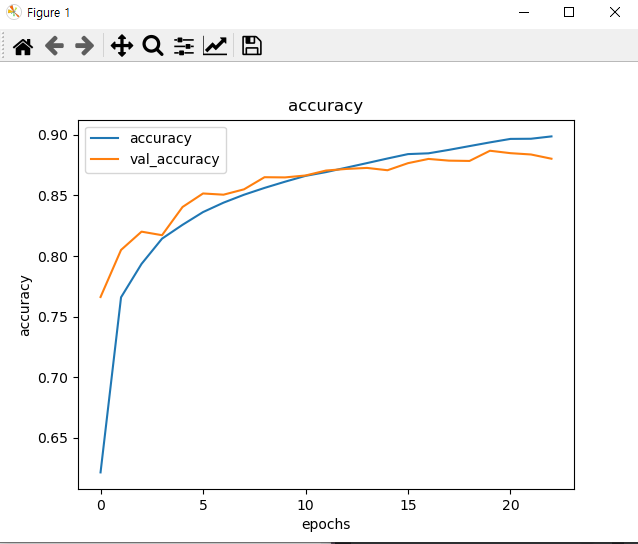 # Fashion MNIST로 CNN 처리 - sub classing model 사용 import tensorflow as tf from keras import datasets, layers, models (x_train, y_train), (x_test, y_test) = datasets.fashion_mnist.load_data() print(x_train.shape, y_train.shape, x_test.shape, y_test.shape) # (60000, 28, 28) (60000,) (10000, 28, 28) (10000,) x_train = x_train / 255.0 x_test = x_test / 255.0 # CNN은 채널을 사용하기 때문에 3차원 데이터를 4차원으로 변경 x_train = x_train.reshape((-1, 28, 28, 1)) # 흑백은 channel이 1개 x_test = x_test.reshape((-1, 28, 28, 1)) # 예) x_test[3, 12, 13, 1] # model class MyModel(models.Model): def __init__(self): super(MyModel, self).__init__() self.conv1 = layers.Conv2D(filters=16, kernel_size=(3, 3), activation='relu') self.conv2 = layers.Conv2D(filters=32, kernel_size=(3, 3), activation='relu') self.conv3 = layers.Conv2D(filters=64, kernel_size=(3, 3), activation='relu') self.pool = layers.MaxPool2D(pool_size=(2, 2)) self.flatten = layers.Flatten() self.dropout = layers.Dropout(0.2) self.d1 = layers.Dense(units=64, activation='relu') self.d2 = layers.Dense(units=32, activation='relu') self.d3 = layers.Dense(units=10, activation='softmax') def call(self, x): x = self.conv1(x) x = self.pool(x) x = self.conv2(x) x = self.pool(x) x = self.conv3(x) x = self.pool(x) x = self.flatten(x) x = self.d1(x) x = self.dropout(x) x = self.d2(x) x = self.dropout(x) return self.d3(x) model = MyModel() # 나머지는 이전 실습과 동일 model.compile(optimizer='adam', loss='sparse_categorical_crossentropy', metrics=['accuracy'])\ from keras.callbacks import EarlyStopping es = EarlyStopping(monitor='val_loss', patience=3) # patience는 많이 줘야됨 history = model.fit(x_train, y_train, batch_size=128, epochs=1000, verbose=0, validation_split=0.2, callbacks=[es]) # history 저장 import pickle history = history.history with open('cnn2_history.pickle', 'wb') as f: pickle.dump(history, f) # 모델 평가 train_loss, train_acc = model.evaluate(x_train, y_train) test_loss, test_acc = model.evaluate(x_test, y_test) print('train_loss : {}, train_acc : {}'.format(train_loss, train_acc)) print('test_loss : {}, test_acc : {}'.format(test_loss, test_acc)) print() # predict import numpy as np print('예측값 :', np.argmax(model.predict(x_test[:1]))) print('예측값 :', np.argmax(model.predict(x_test[[0]]))) # 위랑 같은 의미 print('실제값 :', y_test[0]) # 시각화 import matplotlib.pyplot as plt with open('cnn2_history.pickle', 'rb') as f: history = pickle.load(f) def plot_acc_func(title=None): plt.plot(history['accuracy'], label='accuracy') plt.plot(history['val_accuracy'], label='val_accuracy') plt.title(title) plt.xlabel('epochs') plt.ylabel(title) plt.legend() plot_acc_func('accuracy') plt.show() def plot_loss_func(title=None): plt.plot(history['loss'], label='loss') plt.plot(history['val_loss'], label='val_loss') plt.title(title) plt.xlabel('epochs') plt.ylabel(title) plt.legend() plot_acc_func('loss') plt.show() <console> (60000, 28, 28) (60000,) (10000, 28, 28) (10000,) 1/1875 [..............................] - ETA: 39s - loss: 0.2013 - accuracy: 0.9062 17/1875 [..............................] - ETA: 6s - loss: 0.2065 - accuracy: 0.9283 32/1875 [..............................] - ETA: 6s - loss: 0.2323 - accuracy: 0.9150 46/1875 [..............................] - ETA: 6s - loss: 0.2426 - accuracy: 0.9096 61/1875 [..............................] - ETA: 6s - loss: 0.2448 - accuracy: 0.9114 76/1875 [>.............................] - ETA: 6s - loss: 0.2423 - accuracy: 0.9124 95/1875 [>.............................] - ETA: 5s - loss: 0.2542 - accuracy: 0.9069 114/1875 [>.............................] - ETA: 5s - loss: 0.2523 - accuracy: 0.9071 134/1875 [=>............................] - ETA: 5s - loss: 0.2488 - accuracy: 0.9095 154/1875 [=>............................] - ETA: 5s - loss: 0.2404 - accuracy: 0.9119 175/1875 [=>............................] - ETA: 5s - loss: 0.2429 - accuracy: 0.9104 195/1875 [==>...........................] - ETA: 4s - loss: 0.2382 - accuracy: 0.9138 215/1875 [==>...........................] - ETA: 4s - loss: 0.2379 - accuracy: 0.9135 236/1875 [==>...........................] - ETA: 4s - loss: 0.2392 - accuracy: 0.9133 256/1875 [===>..........................] - ETA: 4s - loss: 0.2390 - accuracy: 0.9137 275/1875 [===>..........................] - ETA: 4s - loss: 0.2403 - accuracy: 0.9126 295/1875 [===>..........................] - ETA: 4s - loss: 0.2406 - accuracy: 0.9128 315/1875 [====>.........................] - ETA: 4s - loss: 0.2411 - accuracy: 0.9126 336/1875 [====>.........................] - ETA: 4s - loss: 0.2408 - accuracy: 0.9126 355/1875 [====>.........................] - ETA: 4s - loss: 0.2393 - accuracy: 0.9129 373/1875 [====>.........................] - ETA: 4s - loss: 0.2414 - accuracy: 0.9124 390/1875 [=====>........................] - ETA: 4s - loss: 0.2437 - accuracy: 0.9114 407/1875 [=====>........................] - ETA: 4s - loss: 0.2437 - accuracy: 0.9109 424/1875 [=====>........................] - ETA: 4s - loss: 0.2449 - accuracy: 0.9106 442/1875 [======>.......................] - ETA: 4s - loss: 0.2448 - accuracy: 0.9106 462/1875 [======>.......................] - ETA: 3s - loss: 0.2437 - accuracy: 0.9104 483/1875 [======>.......................] - ETA: 3s - loss: 0.2450 - accuracy: 0.9099 503/1875 [=======>......................] - ETA: 3s - loss: 0.2450 - accuracy: 0.9098 522/1875 [=======>......................] - ETA: 3s - loss: 0.2479 - accuracy: 0.9091 541/1875 [=======>......................] - ETA: 3s - loss: 0.2482 - accuracy: 0.9087 560/1875 [=======>......................] - ETA: 3s - loss: 0.2485 - accuracy: 0.9086 577/1875 [========>.....................] - ETA: 3s - loss: 0.2496 - accuracy: 0.9079 593/1875 [========>.....................] - ETA: 3s - loss: 0.2496 - accuracy: 0.9076 610/1875 [========>.....................] - ETA: 3s - loss: 0.2505 - accuracy: 0.9074 627/1875 [=========>................