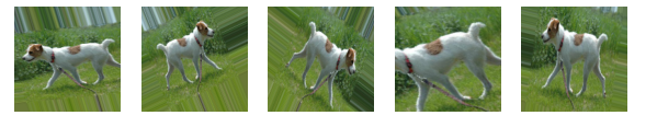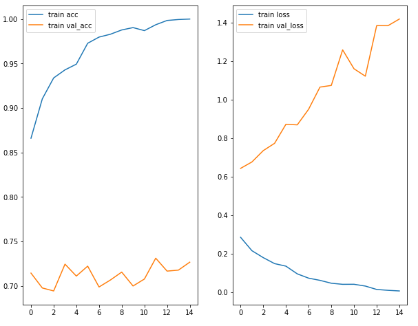 # 과적합 발생 # 원인 : 데이터 수 부족 의심 - 데이터 보강을 해보자 image_gen_train = ImageDataGenerator( rescale=1. / 255, rotation_range=30, width_shift_range=15, height_shift_range=15, horizontal_flip=True, zoom_range=0.5 ) train_data_gen = image_gen_train.flow_from_directory(batch_size=batch_size, directory=train_dir, shuffle=True, target_size=(IMG_HEIGHT, IMG_WIDTH), class_mode='binary') # 보강 이미지 시각화 augmented_img = [train_data_gen[0][0][0] for i in range(5)] plotImage_func(augmented_img) image_gen_val = ImageDataGenerator( rescale=1. / 255 ) train_data_gen = image_gen_val.flow_from_directory(batch_size=batch_size, directory=train_dir, target_size=(IMG_HEIGHT, IMG_WIDTH), class_mode='binary') # new_model new_model = Sequential([ Conv2D(filters=16, kernel_size=3, strides=1, padding='same', input_shape=(IMG_HEIGHT, IMG_WIDTH, 3), activation='relu'), MaxPooling2D(pool_size=2), # pool_size=(2,2) default값 Dropout(rate=0.2), Conv2D(filters=32, kernel_size=3, strides=1, padding='same', activation='relu'), MaxPooling2D(pool_size=2), Dropout(rate=0.2), Conv2D(filters=64, kernel_size=3, strides=1, padding='same', activation='relu'), MaxPooling2D(pool_size=2), Dropout(rate=0.2), Flatten(), Dense(units=512, activation='relu'), Dense(units=1) # 위에서 class_mode에 'binary'를 주었기 때문에 안 줘도 된다. ]) new_model.compile(optimizer='adam', loss=tf.keras.losses.BinaryCrossentropy(from_logits=True), metrics=['accuracy']) print(new_model.summary()) # 새로운 모델로 학습 history = new_model.fit_generator( train_data_gen, steps_per_epoch=total_train // batch_size, # 하나의 에폭을 처리하고 다음 에폭을 시작하기 전까지 generator에서 생성할 단계(샘플배치)의 총갯수 epochs = epochs, validation_data=val_data_gen, validation_steps=total_val // batch_size ) new_model.save('catdog.h5') # 학습 결과 시각화 acc = history.history['accuracy'] val_acc = history.history['val_accuracy'] loss = history.history['loss'] val_loss = history.history['val_loss'] epoch_range = range(epochs) plt.figure(figsize=(10, 8)) plt.subplot(1, 2, 1) plt.plot(epoch_range, acc, label='train acc') plt.plot(epoch_range, val_acc, label='train val_acc') plt.legend(loc='best') plt.subplot(1, 2, 2) plt.plot(epoch_range, loss, label='train loss') plt.plot(epoch_range, val_loss, label='train val_loss') plt.legend(loc='best') plt.show() <console> Model: "sequential_1" _________________________________________________________________ Layer (type) Output Shape Param # ================================================================= conv2d_3 (Conv2D) (None, 150, 150, 16) 448 max_pooling2d_3 (MaxPooling (None, 75, 75, 16) 0 2D) dropout (Dropout) (None, 75, 75, 16) 0 conv2d_4 (Conv2D) (None, 75, 75, 32) 4640 max_pooling2d_4 (MaxPooling (None, 37, 37, 32) 0 2D) dropout_1 (Dropout) (None, 37, 37, 32) 0 conv2d_5 (Conv2D) (None, 37, 37, 64) 18496 max_pooling2d_5 (MaxPooling (None, 18, 18, 64) 0 2D) dropout_2 (Dropout) (None, 18, 18, 64) 0 flatten_1 (Flatten) (None, 20736) 0 dense_2 (Dense) (None, 512) 10617344 dense_3 (Dense) (None, 1) 513 ================================================================= Total params: 10,641,441 Trainable params: 10,641,441 Non-trainable params: 0 _________________________________________________________________ None오버피팅이 되었기때문에 이미지를 보강하고 Dropout을 사용해보았다.