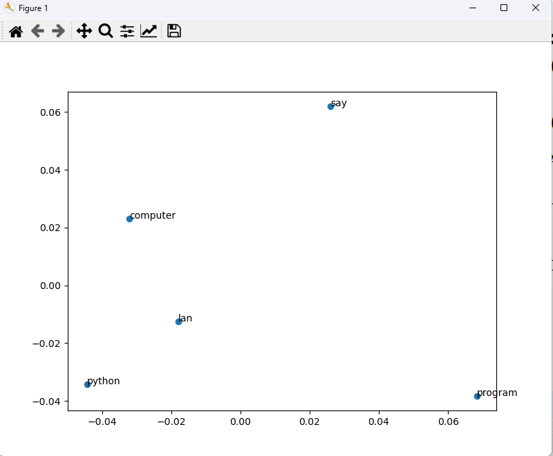 출처 = https://cafe.daum.net/flowlife/S2Ul/19 # 데이터 인코딩 print('레이블 인코딩') datas = ['python', 'program', 'computer', 'lan', 'say'] values =[] for x in range(len(datas)): values.append(x) print(values, ' ', type(values)) print('원핫 인코딩') import numpy as np onehot = np.eye(len(datas)) print(onehot) print('\n인코딩 클래스를 사용') from sklearn.preprocessing import LabelEncoder datas = ['python', 'program', 'computer', 'lan', 'say'] encoder = LabelEncoder().fit(datas) values = encoder.transform(datas) print(values, type(values)) print(encoder.classes_) print('밀집표현 : 단어의 의미를 다차원 공간에 실수로 벡터화 하는 분산표현 방법. 단어 간 유사성을 표현할 수 있다.') from gensim.models import word2vec sentence = [['python', 'program', 'computer', 'lan', 'say']] model = word2vec.Word2Vec() sentece = [['python', 'program', 'computer', 'lan', 'say']] # Word2Vec을 이용 : 유사한 단어들을 비슷한 방향과 힘의 벡터를 갖도록 변환하여 사용하는 방법 model = word2vec.Word2Vec(sentence, min_count=1, vector_size=50) print(model) word_vectors = model.wv # 단어 벡터 생성 print('word_vectors :', word_vectors) # KeyedVectors object print('word_vectors index :', word_vectors.key_to_index) print('word_vectors keys :', word_vectors.key_to_index.keys()) print('word_vectors values :', word_vectors.key_to_index.values()) vocabs = word_vectors.key_to_index.keys() word_vectors_list = [word_vectors[v] for v in vocabs] print(word_vectors_list[0], ' ', word_vectors_list[1]) # 단어 간 유사도 print(word_vectors.similarity(w1='python', w2='computer')) print(word_vectors.similarity(w1='python', w2='say')) print(word_vectors.most_similar(positive='computer')) # 코사인 유사도 알고리즘 이용 : -1 ~0 ~1 절대값 1에 근사 # 단어 간 유사도 시각화 import matplotlib.pyplot as plt def plot_2d(vocabs, x, y): plt.figure(figsize = (8, 6)) plt.scatter(x, y) for i, v in enumerate(vocabs): plt.annotate(v, xy=(x[i], y[i])) from sklearn.decomposition import PCA pca = PCA(n_components=2) xys = pca.fit_transform(word_vectors_list) xs = xys[:, 0] ys = xys[:, 1] plot_2d(vocabs, xs, ys) plt.show() <console> 레이블 인코딩 [0, 1, 2, 3, 4] <class 'list'> 원핫 인코딩 [[1. 0. 0. 0. 0.] [0. 1. 0. 0. 0.] [0. 0. 1. 0. 0.] [0. 0. 0. 1. 0.] [0. 0. 0. 0. 1.]] 인코딩 클래스를 사용 [3 2 0 1 4] <class 'numpy.ndarray'> ['computer' 'lan' 'program' 'python' 'say'] 밀집표현 : 단어의 의미를 다차원 공간에 실수로 벡터화 하는 분산표현 방법. 단어 간 유사성을 표현할 수 있다. Word2Vec(vocab=5, vector_size=50, alpha=0.025) word_vectors : <gensim.models.keyedvectors.KeyedVectors object at 0x00000259CD549D60> word_vectors index : {'say': 0, 'lan': 1, 'computer': 2, 'program': 3, 'python': 4} word_vectors keys : dict_keys(['say', 'lan', 'computer', 'program', 'python']) word_vectors values : dict_values([0, 1, 2, 3, 4]) [-1.0724545e-03 4.7286032e-04 1.0206699e-02 1.8018546e-02 -1.8605899e-02 -1.4233618e-02 1.2917743e-02 1.7945977e-02 -1.0030856e-02 -7.5267460e-03 1.4761009e-02 -3.0669451e-03 -9.0732286e-03 1.3108101e-02 -9.7203208e-03 -3.6320353e-03 5.7531595e-03 1.9837476e-03 -1.6570430e-02 -1.8897638e-02 1.4623532e-02 1.0140524e-02 1.3515387e-02 1.5257311e-03 1.2701779e-02 -6.8107317e-03 -1.8928051e-03 1.1537147e-02 -1.5043277e-02 -7.8722099e-03 -1.5023164e-02 -1.8600845e-03 1.9076237e-02 -1.4638334e-02 -4.6675396e-03 -3.8754845e-03 1.6154870e-02 -1.1861792e-02 9.0322494e-05 -9.5074698e-03 -1.9207101e-02 1.0014586e-02 -1.7519174e-02 -8.7836506e-03 -7.0199967e-05 -5.9236528e-04 -1.5322480e-02 1.9229483e-02 9.9641131e-03 1.8466286e-02] [-0.01631584 0.00899159 -0.00827415 0.00164907 0.01699724 -0.00892436 0.009035 -0.01357392 -0.00709698 0.01879702 -0.00315531 0.00064274 -0.00828126 -0.01536538 -0.00301602 0.00493959 -0.00177606 0.01106732 -0.00548595 0.00452013 0.01091159 0.0166919 -0.00290748 -0.01841629 0.0087411 0.00114357 0.01488381 -0.00162657 -0.00527683 -0.01750602 -0.00171311 0.00565312 0.01080286 0.01410531 -0.01140625 0.00371764 0.01217772 -0.0095961 -0.00621452 0.01359526 0.00326295 0.00037983 0.00694727 0.00043555 0.01923765 0.01012121 -0.01783478 -0.01408312 0.00180291 0.01278507] 0.1656355 -0.11821285 [('python', 0.16563549637794495), ('say', 0.1267007291316986), ('lan', 0.011071926914155483), ('program', -0.1551557034254074)]단어와 단어 사이의 관계를 수치로 표현할 수 있다.