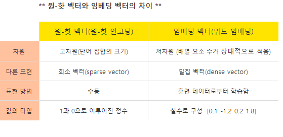 워드 임베딩 : 단어를 수치화해서 vector로 만듦, 단어를 밀집 벡터(dense vector)의 형태로 표현하는 방법
