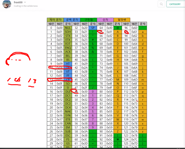 아스키 코드표(ASCII CODE) 최소한 체크 된 곳 정도는 알아두자.