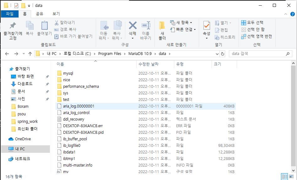 데이터베이스를 생성했으면 MariaDB를 설치한 경로에 만든 데이터베이스가 설치되어있다.