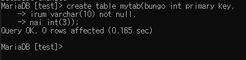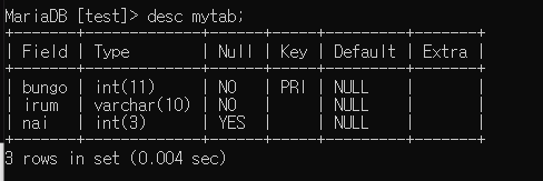 desc mytab; 을 입력하면 mytab table의 구조를 볼 수 있다.