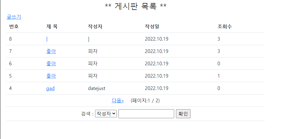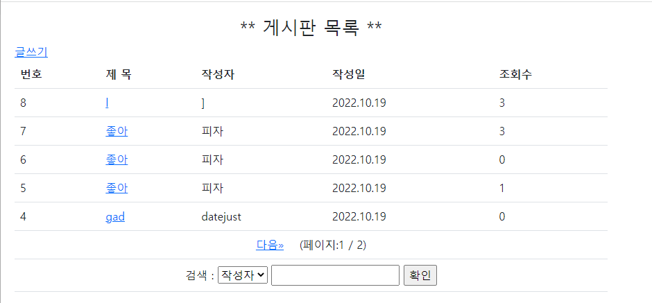 <!DOCTYPE html> <html> <head> <meta charset="UTF-8"> <title>Insert title here</title> <link rel="stylesheet" href="https://cdn.jsdelivr.net/npm/bootstrap@5.2.2/dist/css/bootstrap.min.css" /> </head> <body style="margin:20px;"> <div style="width:95%; text-align: center;"> <h3>** 게시판 목록 **</h3> </div> <a href="/board/insert">글쓰기</a> <table style="width: 95%;" class="table"> <tr> <th>번호</th> <th>제 목</th> <th>작성자</th> <th>작성일</th> <th>조회수</th> </tr> {% if datas %} {% for d in datas %} <tr> <td>{{d.id}}</td> <td> <a href="/board/content?id={{d.id}}&page={{datas.number}}">{{d.title}}</a> </td> <td>{{d.name}}</td> <td>{{d.bdate.year}}.{{d.bdate.month}}.{{d.bdate.day}}</td> <td>{{d.readcnt}}</td> </tr> {% endfor %} <!-- 페이징 처리 --> <tr> <td colspan="5" style="text-align: center;"> {% if datas.paginator.num_pages > 1 %} <div> {% if datas.has_previous %} <!-- 이전 페이지가 있다면 --> <a href="/board/list?page={{datas.previous_page_number}}">«이전</a> {% endif %} {% if datas.has_next %} <!-- 이전 페이지가 있다면 --> <a href="/board/list?page={{datas.next_page_number}}">다음»</a> {% endif %} (페이지:{{datas.number}} / {{datas.paginator.num_pages}}) </div> {% endif %} </td> </tr> {% else %} <tr> <td colspan="5">자료가 없습니다.</td> </tr> {% endif %} <!-- 검색 기능 --> <tr> <td colspan="5" style="text-align: center;"> <form action="/board/search" method="post">{% csrf_token %} 검색 : <select name="s_type"> <option value="title" selected>글제목</option> <option value="name" selected>작성자</option> </select> <input type="text" name="s_value"/> <input type="submit" value="확인" /> </form> </td> </tr> </table> </body> </html>select 문을 만들어서 글제목, 작성자 형태로 출력시킨다. 글제목은 title, 작성자는 name으로 만든다.