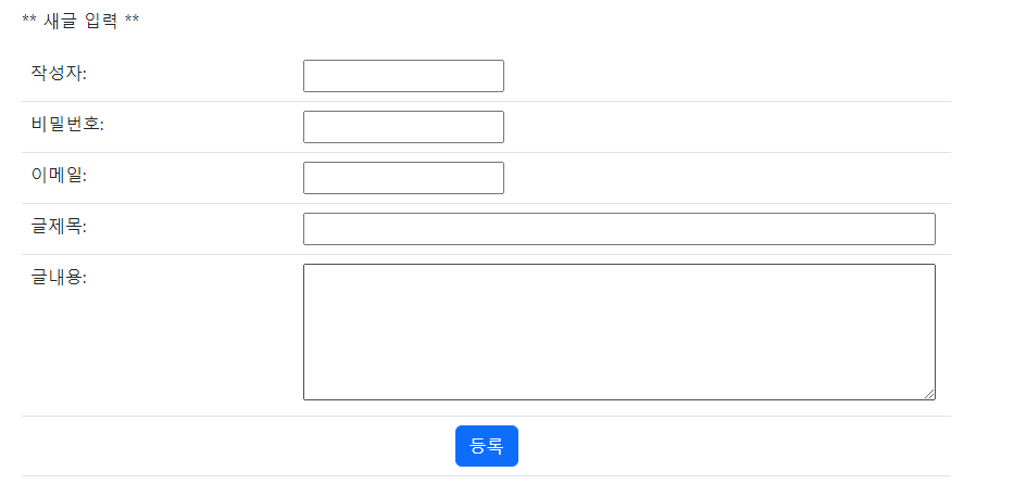 <!DOCTYPE html> <html> <head> <meta charset="UTF-8"> <title>Insert title here</title> <link rel="stylesheet" href="https://cdn.jsdelivr.net/npm/bootstrap@5.2.2/dist/css/bootstrap.min.css" /> <script> window.onload = function(){ document.querySelector("#btnOk").onclick = chkFunc; } function chkFunc(){ // alert('a'); if(frm.name.value === ""){ alert('작성자를 입력하시오'); frm.name.focus() return; } // 나머지는 생략 frm.submit(); } </script> </head> <body style="margin:20px;"> <p>** 새글 입력 **</p> <form action="/board/insertok" name="frm" method="post">{% csrf_token %} <table style="width: 95%;" class="table"> <tr> <td>작성자:</td> <td><input type="text" name="name"/></td> </tr> <tr> <td>비밀번호:</td> <td><input type="text" name="passwd"/></td> </tr> <tr> <td>이메일:</td> <td><input type="email" name="mail"/></td> </tr> <tr> <td>글제목:</td> <td><input type="text" style="width: 99%" name="title"/></td> </tr> <tr> <td>글내용:</td> <td><textarea rows="5" style="width: 99%" name="cont"></textarea></td> </tr> <tr> <td colspan="2" style="text-align: center;"> <input type="button" value="등록" id="btnOk" class="btn btn-primary"/> </td> </tr> </table> </form> </body> </html>POST 타입으로 값들을 views.py의 insertok 함수로 보낸다.