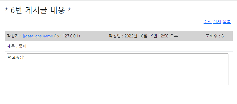 <!DOCTYPE html> <html> <head> <meta charset="UTF-8"> <title>Insert title here</title> <link rel="stylesheet" href="https://cdn.jsdelivr.net/npm/bootstrap@5.2.2/dist/css/bootstrap.min.css" /> </head> <body style="margin:20px;"> <h2>* {{data_one.id}}번 게시글 내용 *</h2> <table class="table"> <tr style="width:95%;"> <td style="text-align: right; width: 95%"> <a href="/board/update?id={{data_one.id}}">수정</a> <a href="/board/delete?id={{data_one.id}}">삭제</a> <a href="/board/list?page={{page}}">목록</a> </td> </tr> </table> <table class="table"> <tr style="width: 95%; background-color: lightgray"> <td> 작성자 : <a href="mailto:{{data_one.mail}}">{{data_one.name</a> (ip : {{data_one.bip}}) </td> <td>작성일 : {{data_one.bdate}}</td> <td>조회수 : {{data_one.readcnt}}</td> </tr> <tr> <td colspan="3">제목 : {{data_one.title}}</td> </tr> <tr> <td colspan="3"> <textarea rows="5" style="width:99%;" readonly>{{data_one.cont}}</textarea> </td> </tr> </table> </body> </html>board.html에서 content.html로 갈 수 있게 a태그를 사용했다. content.html로 오면 id값으로 데이터를 불러와 그것을 넣어준다. 목록으로 돌아갈 수도 있기때문에 해당 글이 있는 페이지로 갈 수 있도록 page 데이터를 넣어주었다.
