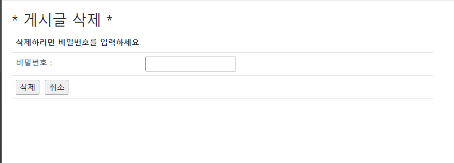 def deleteFunc(request): try: del_data = BoardTab.objects.get(id=request.GET.get('id')) except Exception as e: return render(request, 'error.html') return render(request, 'delete.html', {'data_one':del_data}) def deleteOkFunc(request): del_data=BoardTab.objects.get(id=request.POST.get('id')) if del_data.passwd == request.POST.get('del_passwd'): del_data.delete(); return redirect('/board/list') #삭제 후 보드의 리스트로 보내주기(목록보기) else: return render(request, 'error.html')id 값을 가져와서 그것을 다시 deleteOkFunc 로 보내서 id값의 컬럼을 삭제한다.