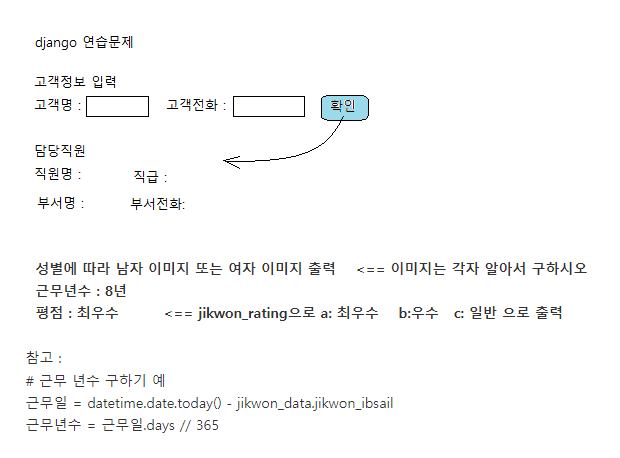 <!DOCTYPE html> <html> <head> <meta charset="UTF-8"> <title>Insert title here</title> </head> <body> <h3>담당직원</h3> <table style="width:50%" border=1> <tr> <td rowspan="2" style="width:30%;"> {% if jd.jikwon_gen == "남" %} <img style="width:100%;" src="/static/images/man.png"> {% else %} <img style="width:100%;" src="/static/images/woman.png"> {% endif %} </td> <td>직원명:</td><td>{{jd.jikwon_name}}</td><td>직급:</td><td>{{jd.jikwon_jik}}</td></tr> <tr><td>부서명:</td><td>{{bd.buser_name}}</td><td>부서전화:</td><td>{{bd.buser_tel}}</td></tr> <tr><td colspan="2">근무년수:</td><td>{{workyears}}년</td><td>평점:</td> {% if jd.jikwon_rating == "a" %} <td>최우수</td> {% elif jd.jikwon_rating == "b" %} <td>우수</td> {% else %} <td>일반</td> {% endif %} </tr> </table> </body> </html>main.html에서 가져온 정보를 views.py의 show()함수에서 받아서 정보를 정리한다음 변수명에 담아 넘겼으므로 그 변수명을 사용하여 테이블의 정보를 호출할 수 있다.