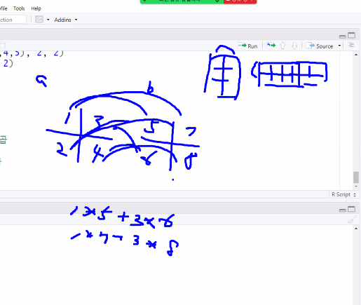a [,1] [,2] [1,] 1 3 [2,] 2 4 b [,1] [,2] [1,] 5 7 [2,] 6 8 a %*% b #행렬 곱곱 [,1] [,2] [1,] 23 31 [2,] 34 46