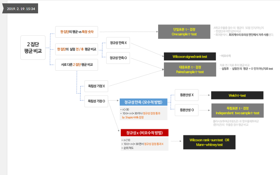 # - 두 집단 이하의 변수에 대한 평균차이를 검정할 경우 T-test를 사용하여 검정통계량 T값을 구해 가설검정을 한다.