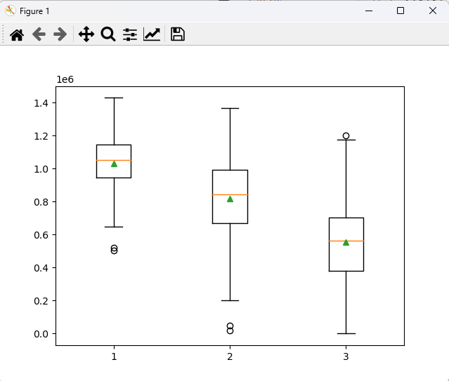 # plt.boxplot([group1, group2, group3], showmeans = True)